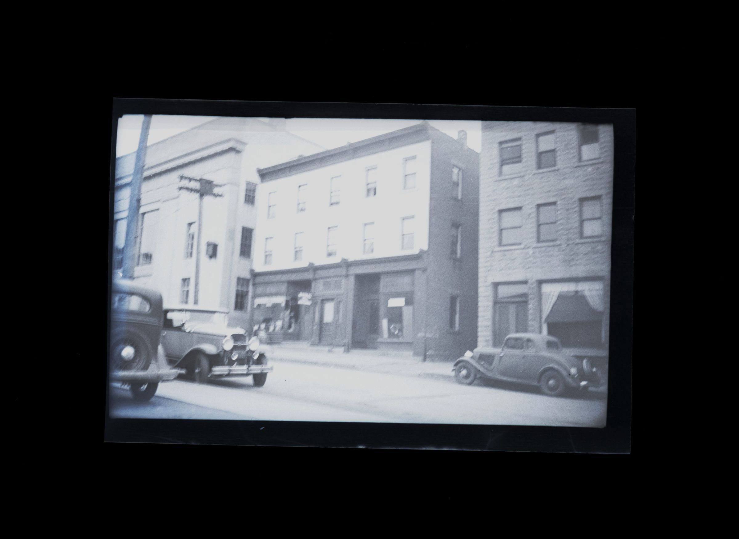 Image centered on a three story storefront with other business buildings on either side. Cars are parked on either side of the street.Collection