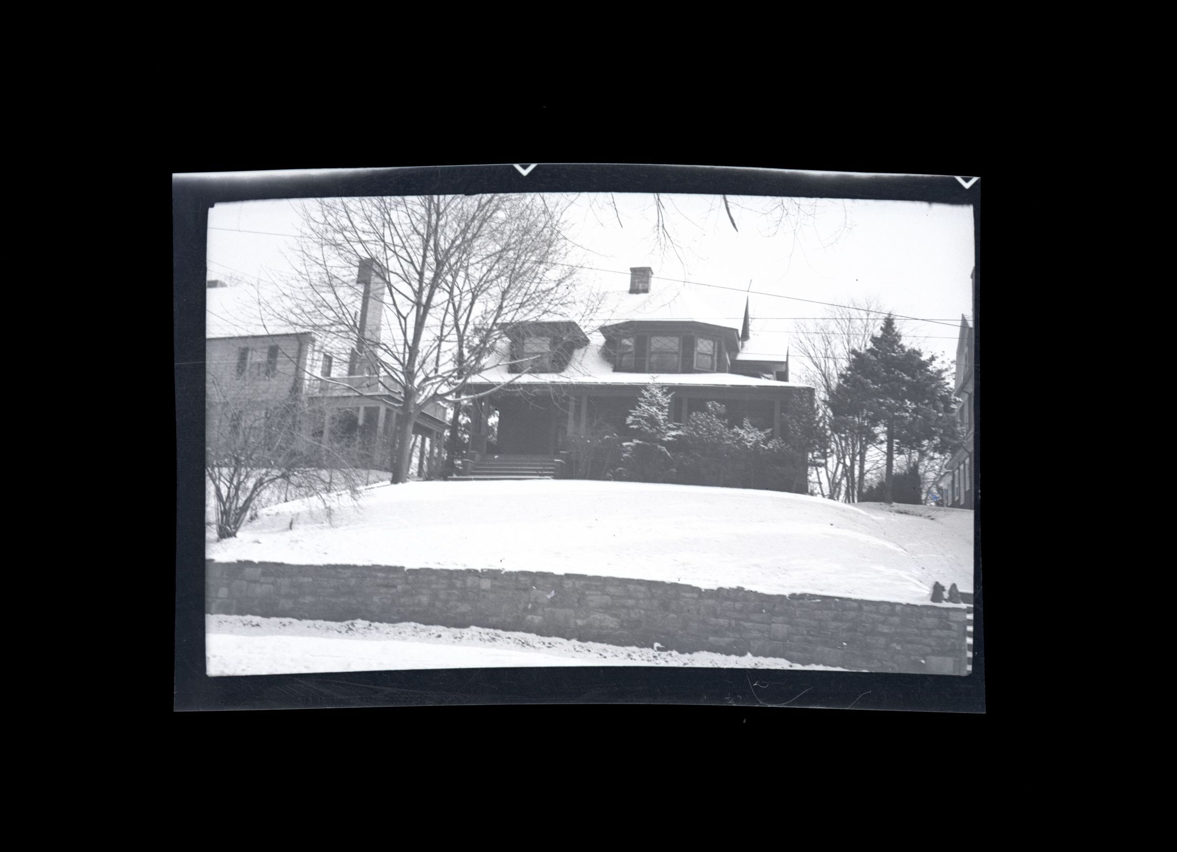 A three story house with a full length porch and dormers in the snow.