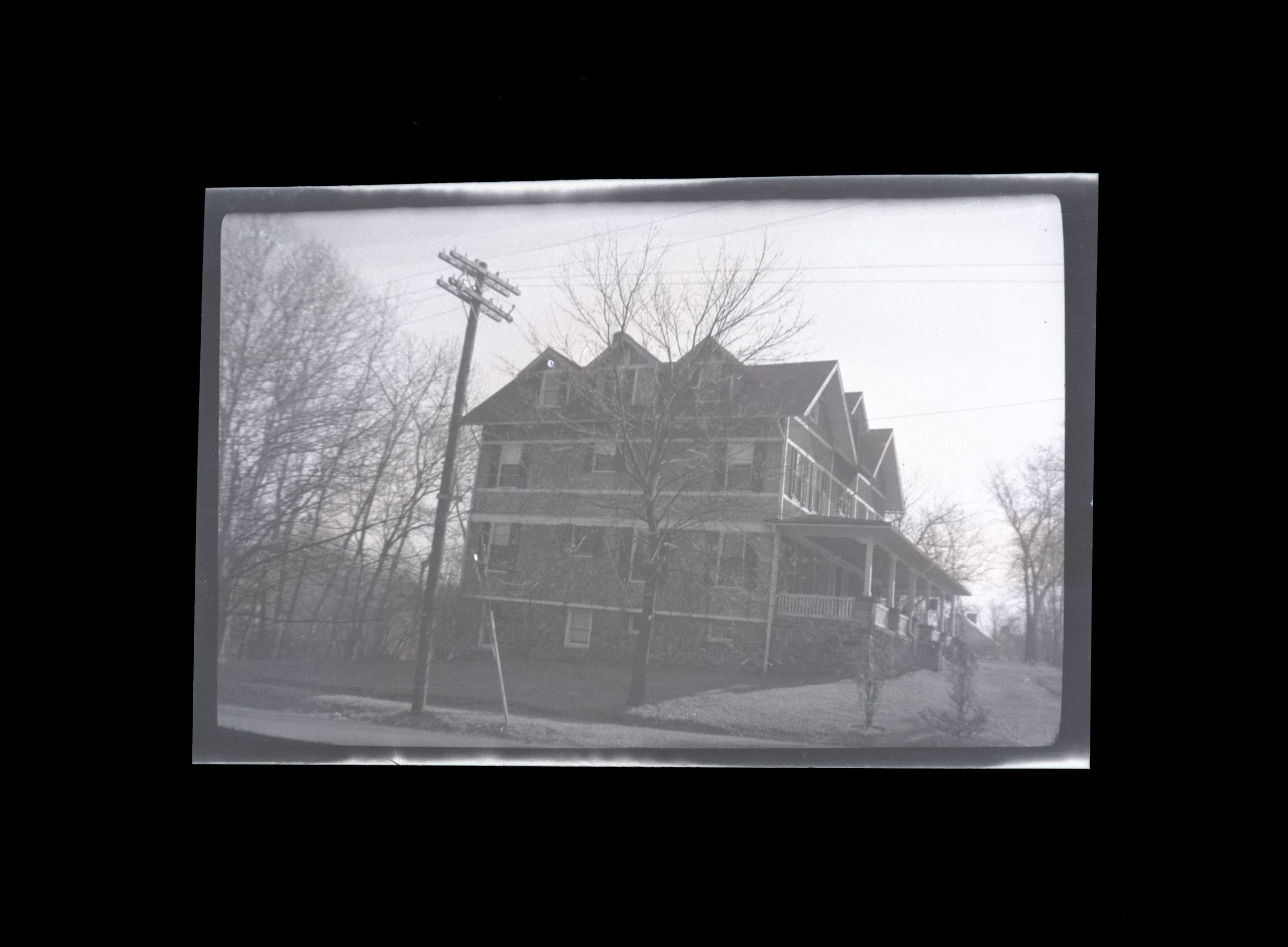 A four story house with top-floor dormers and a covered porch, viewed side-on from the street.Collection