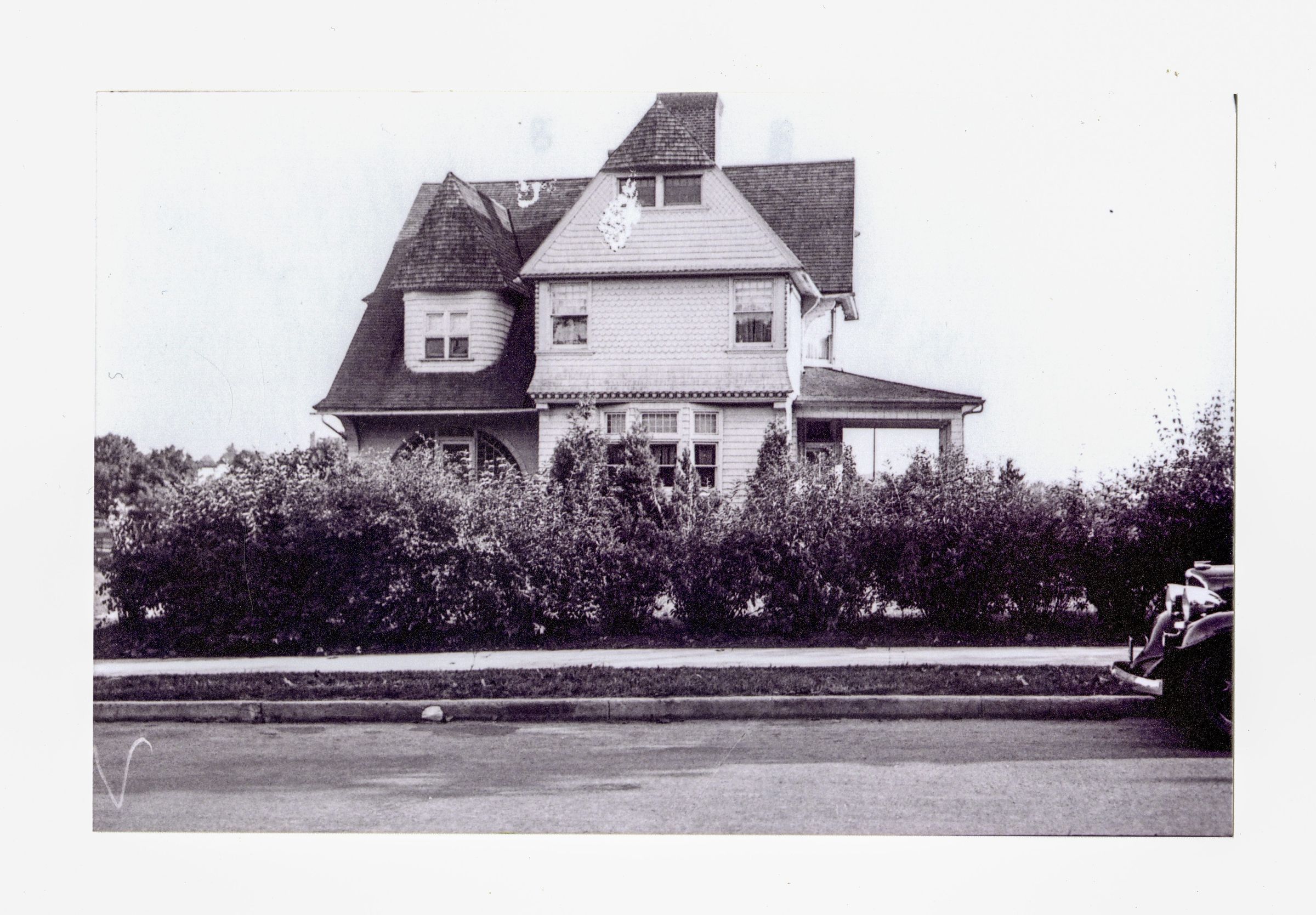 A three story house with scalloped shingling on parts of the exterior walls.