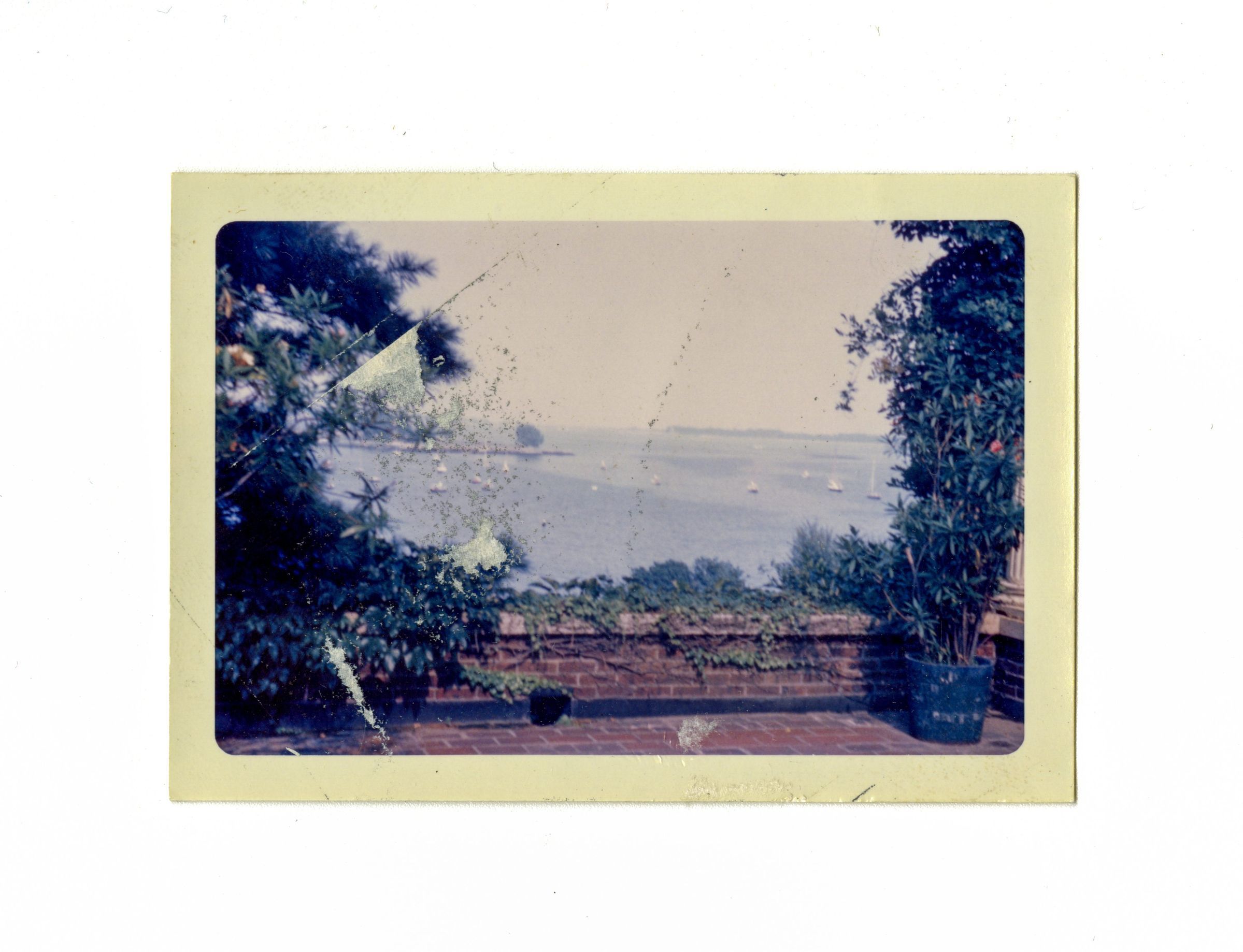 A view looking out at Long Island Sound from a brick patio on the estate.