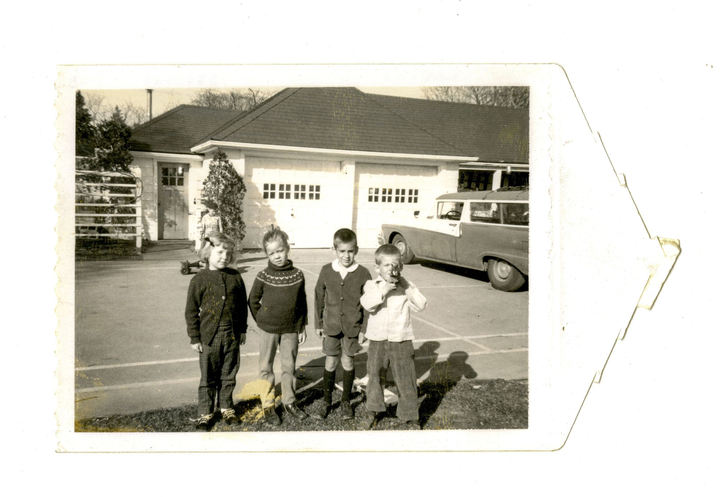Four children posing for a picture in front of a two door garage with a parked car on the right of the image.Collection