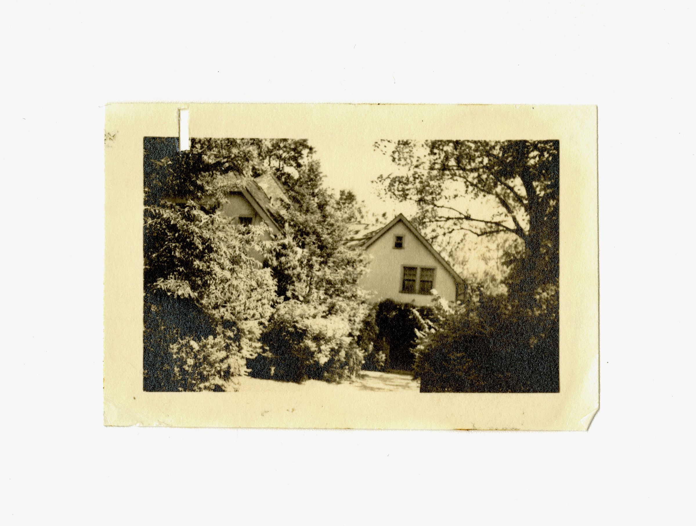A section of a three story house; the rest of the house is obscured by trees in the image.Collection