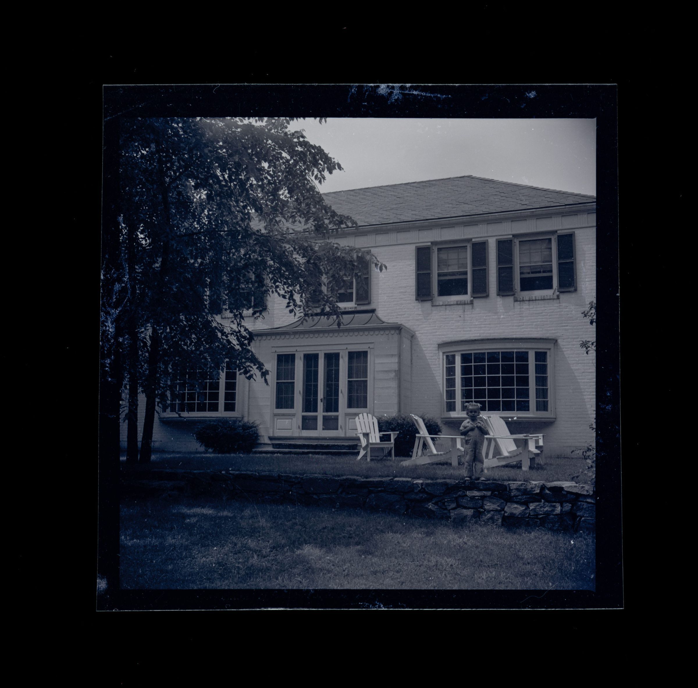 A two story brick house with a child standing on the lawn in front of lawn chairs.Collection