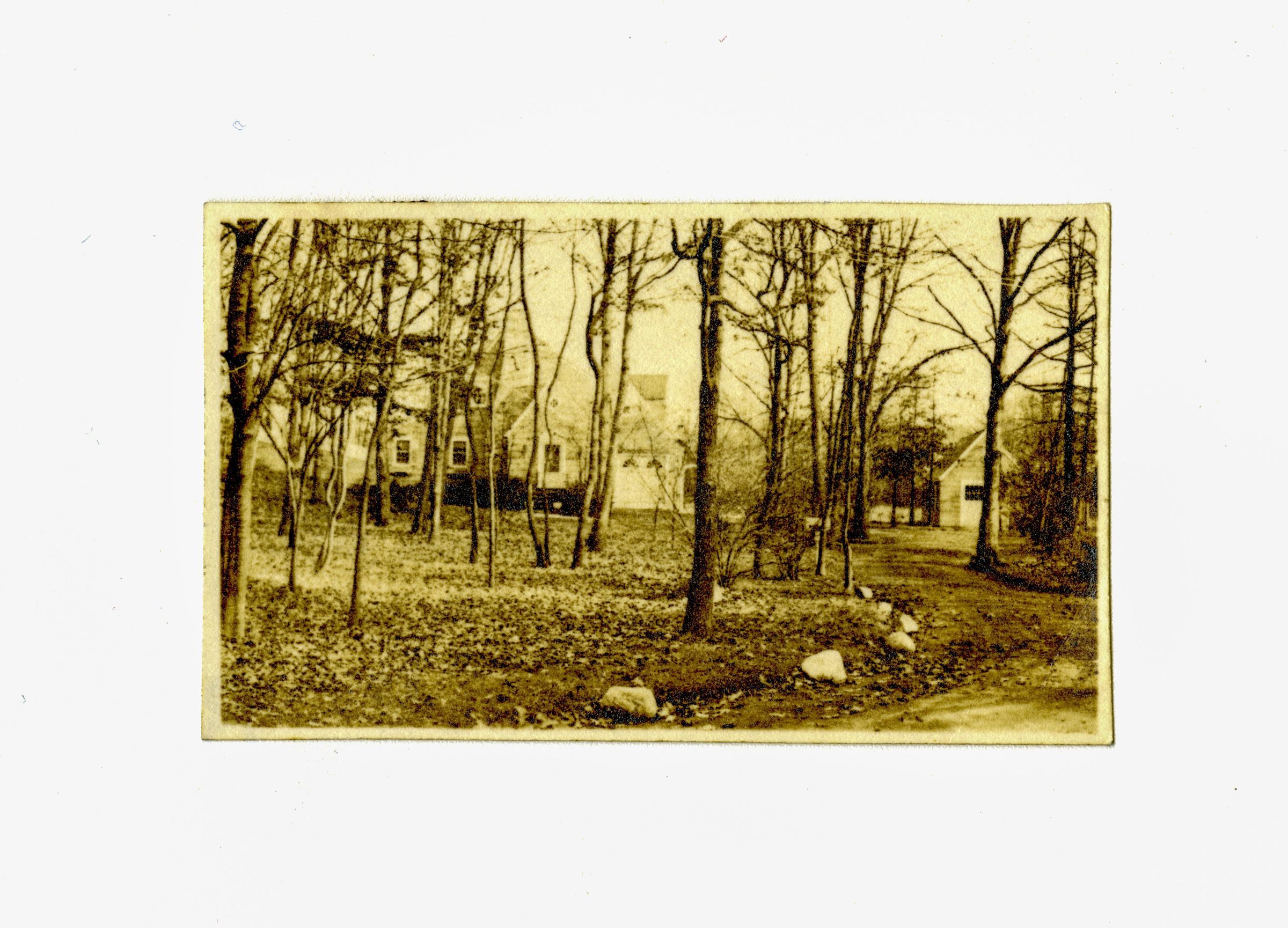 A view of a home through a lightly wooded area on the property.