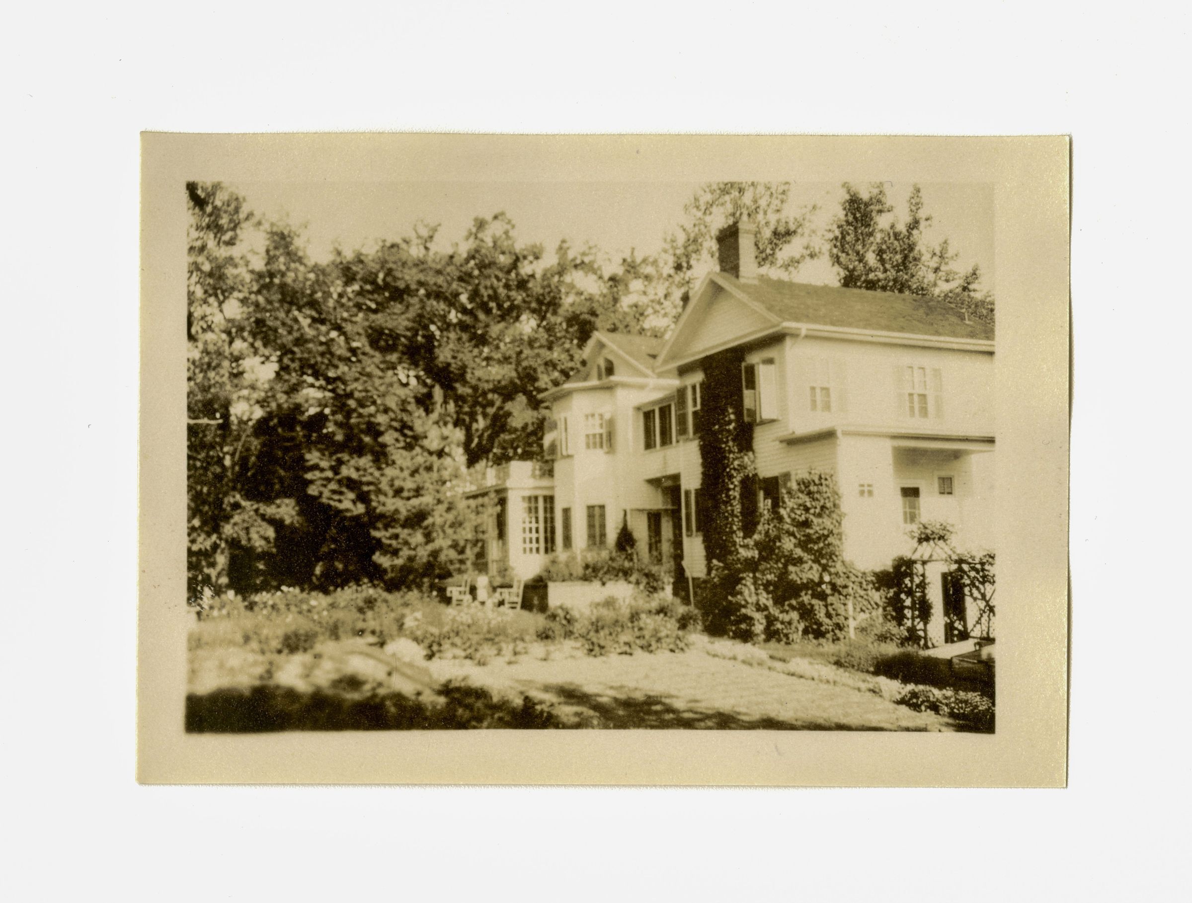 A three story house and its gardens.
