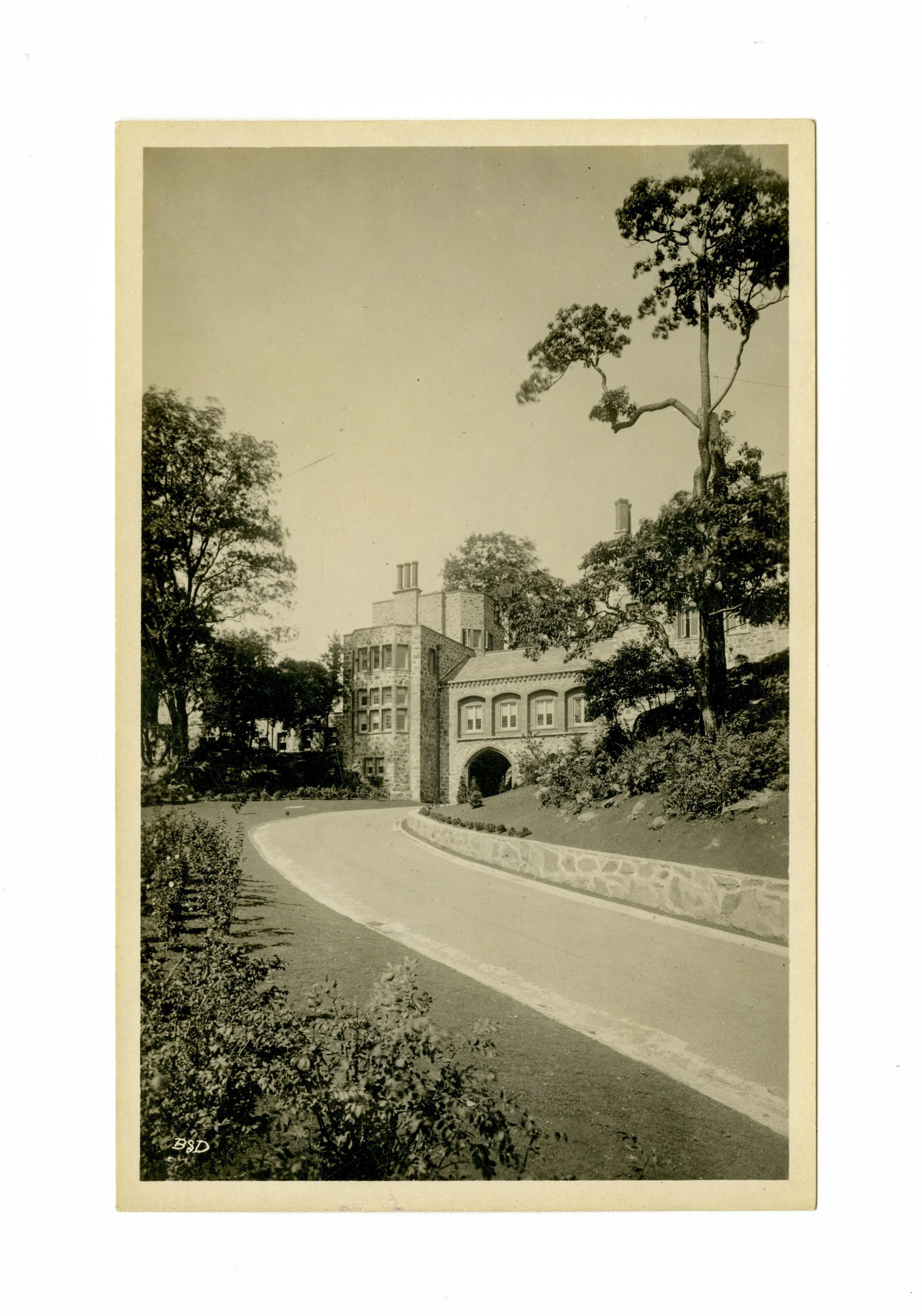 The view from the driveway of a wing of a stone home built in the style of a Medieval manor.Collection