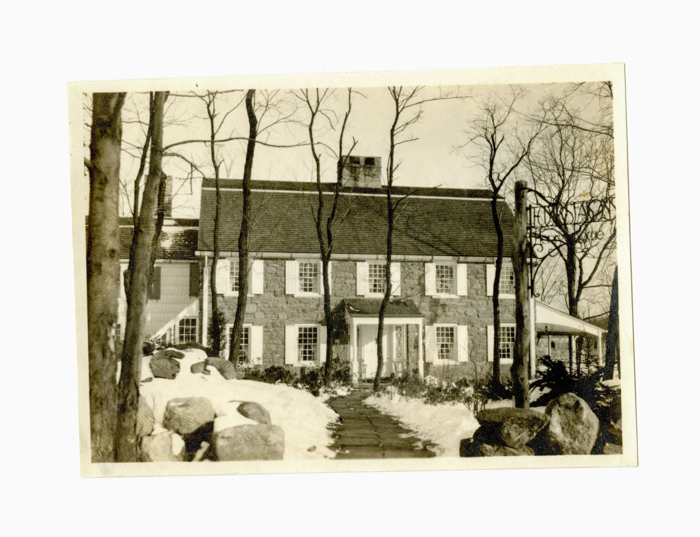 A three story house whose main section has stone walls while the other wings have clapboard siding. A signpost with wrought iron decorative writing is on the left of the image.Collection