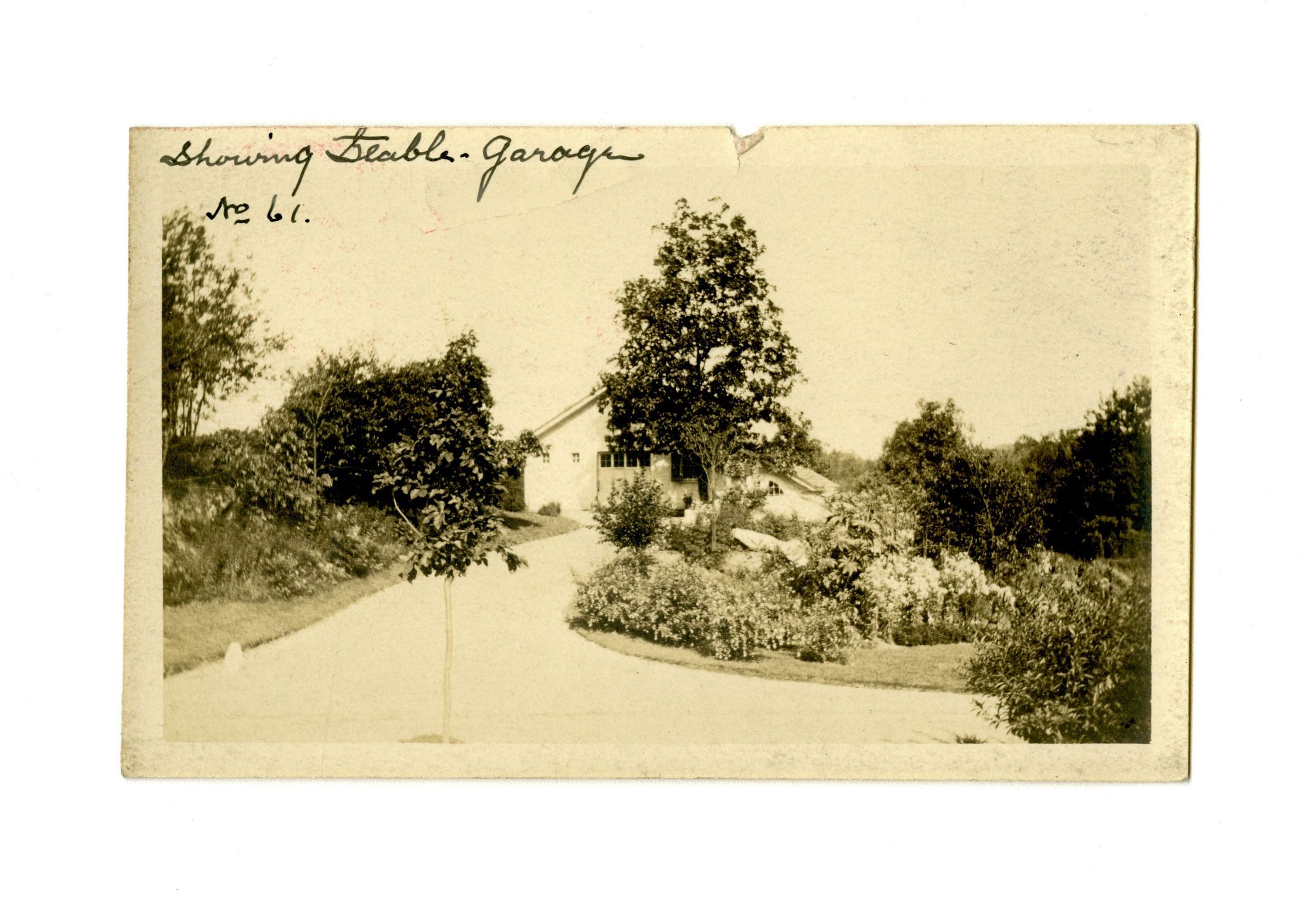 A view from the driveway of a garage and stable building and part of the gardens.Collection
