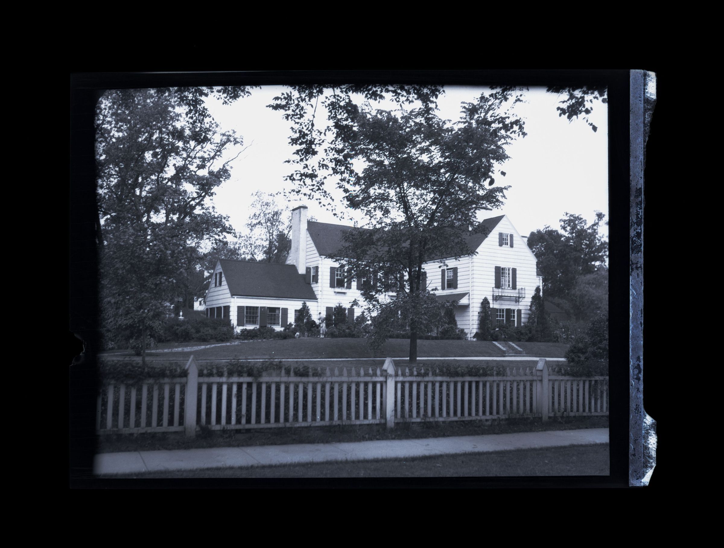 A three story house and its lawn viewed from the street.