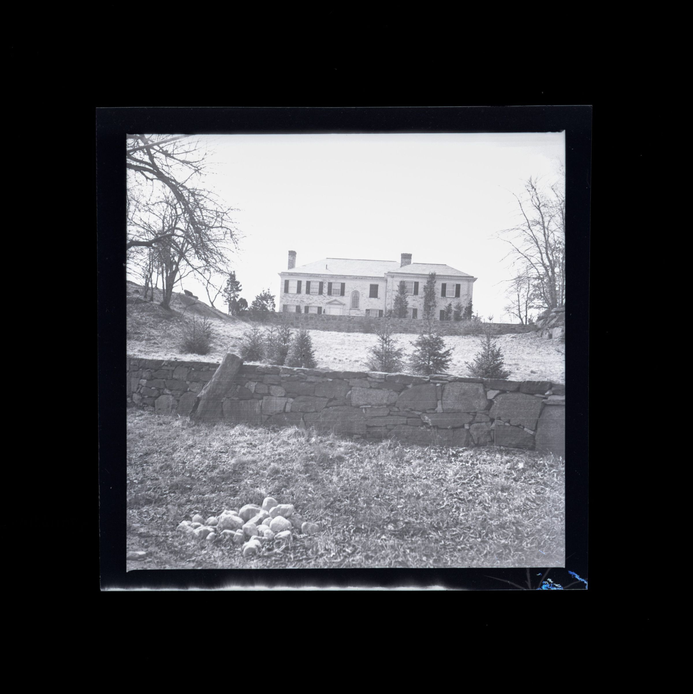 A view looking up a hill towards a two story house with a stone wall in the foreground of the image.Collection