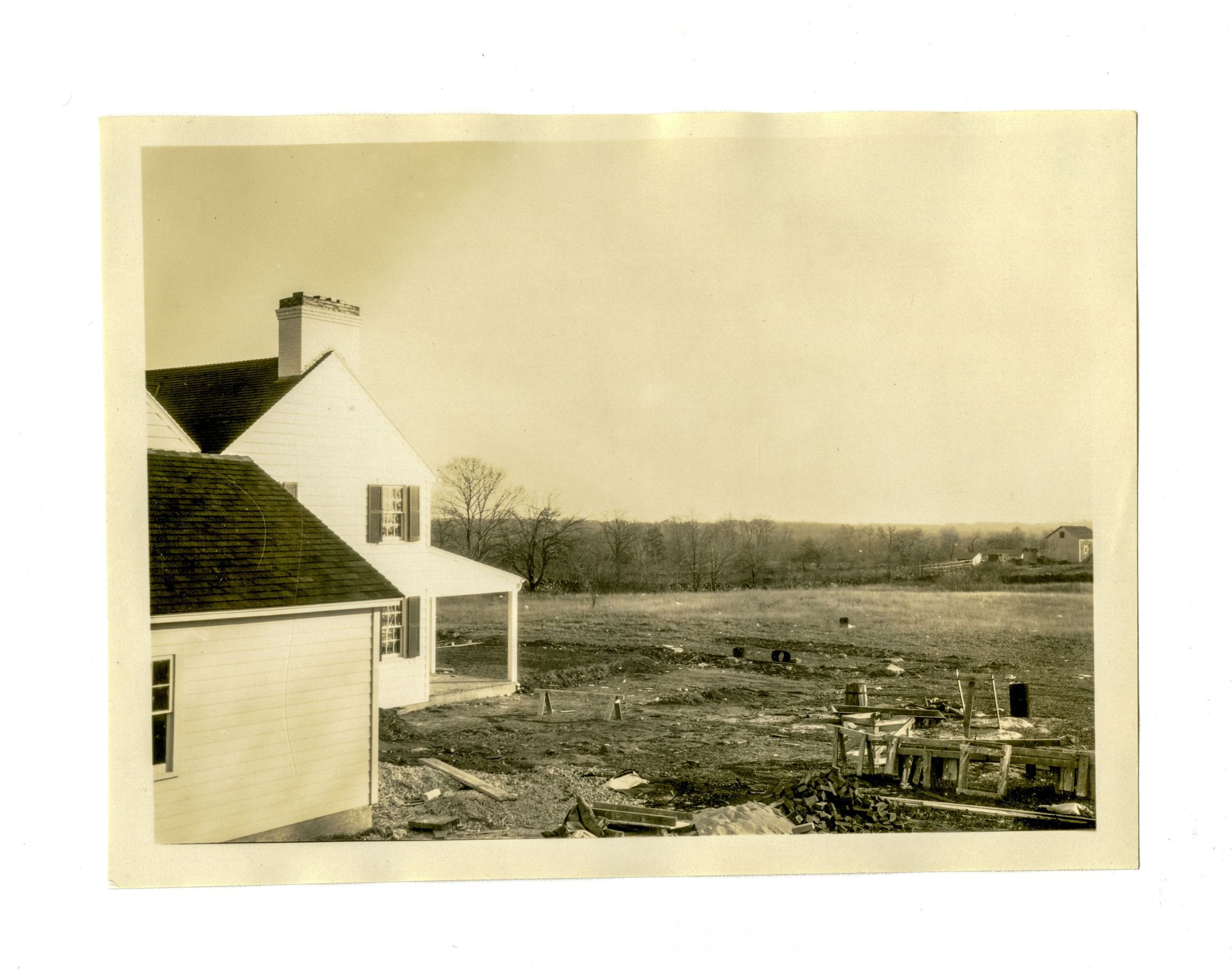 The side of a clapboard house with the part of the lawn dug up and filled with trash.