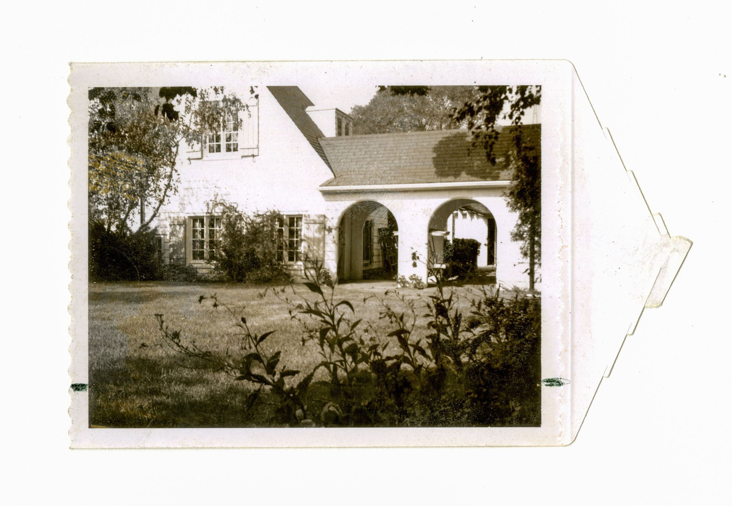 The back of a two story house with two archways leading from the back yard to another section of the property.Collection