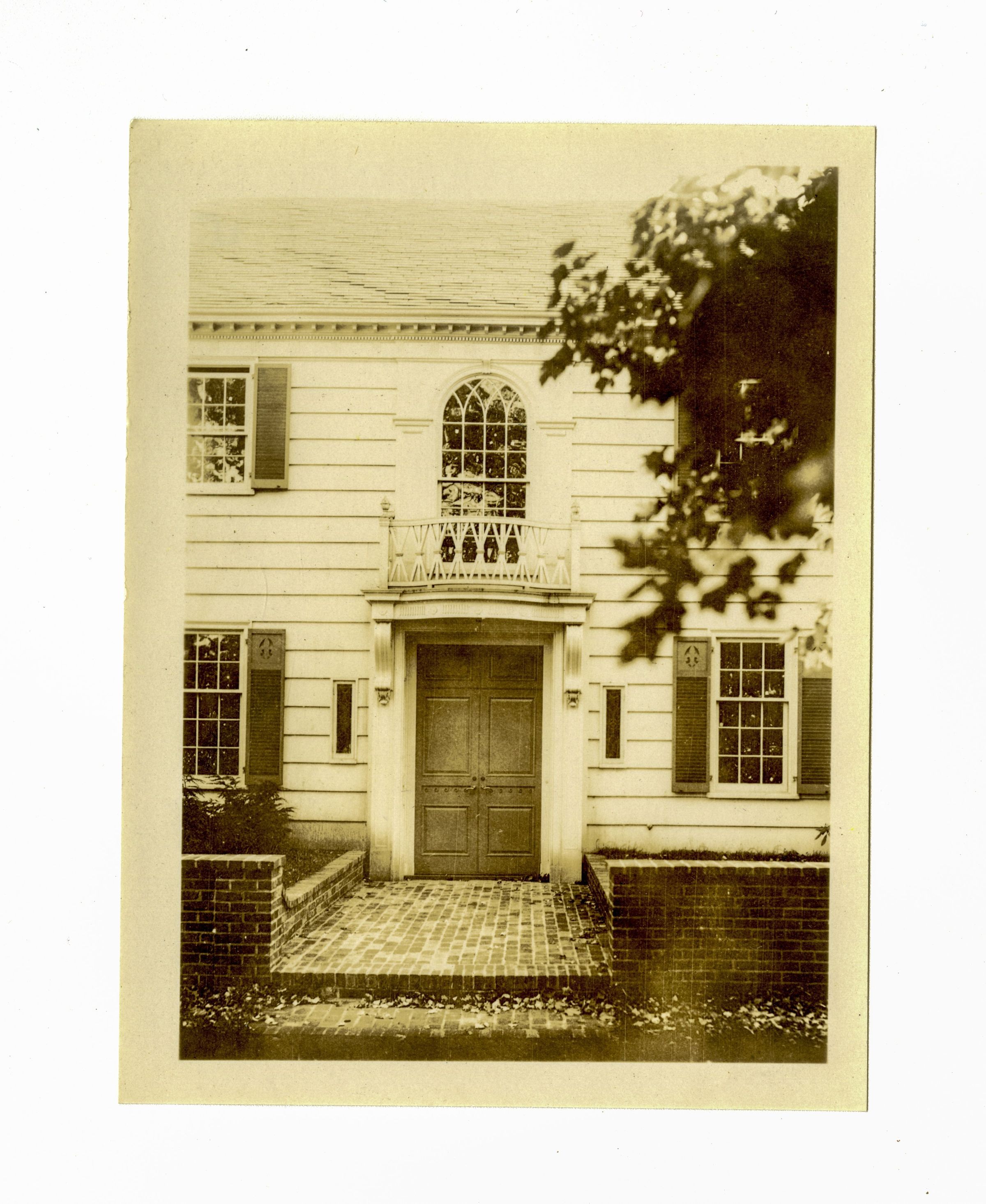 The entrance to a two story clapboard house. The entrance is made up of wooden double doors with a small balcony overhand at the end of a short brick pathway.Collection