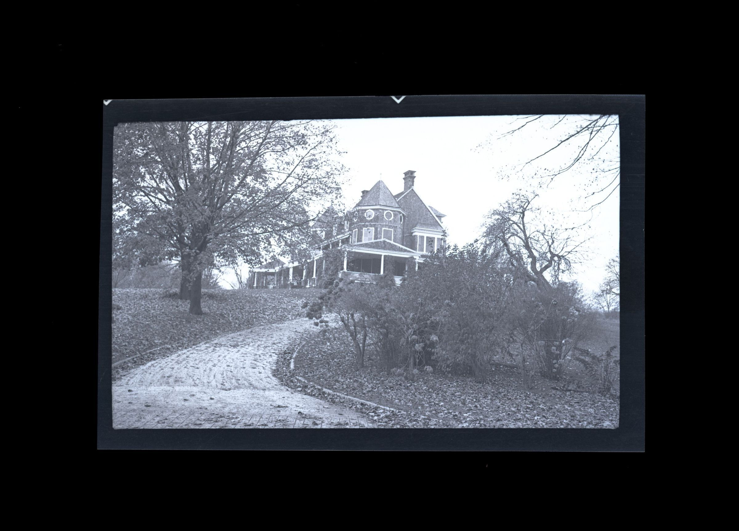 A three story shingle house with two octagonal towers as viewed from the bottom of its driveway.Collection