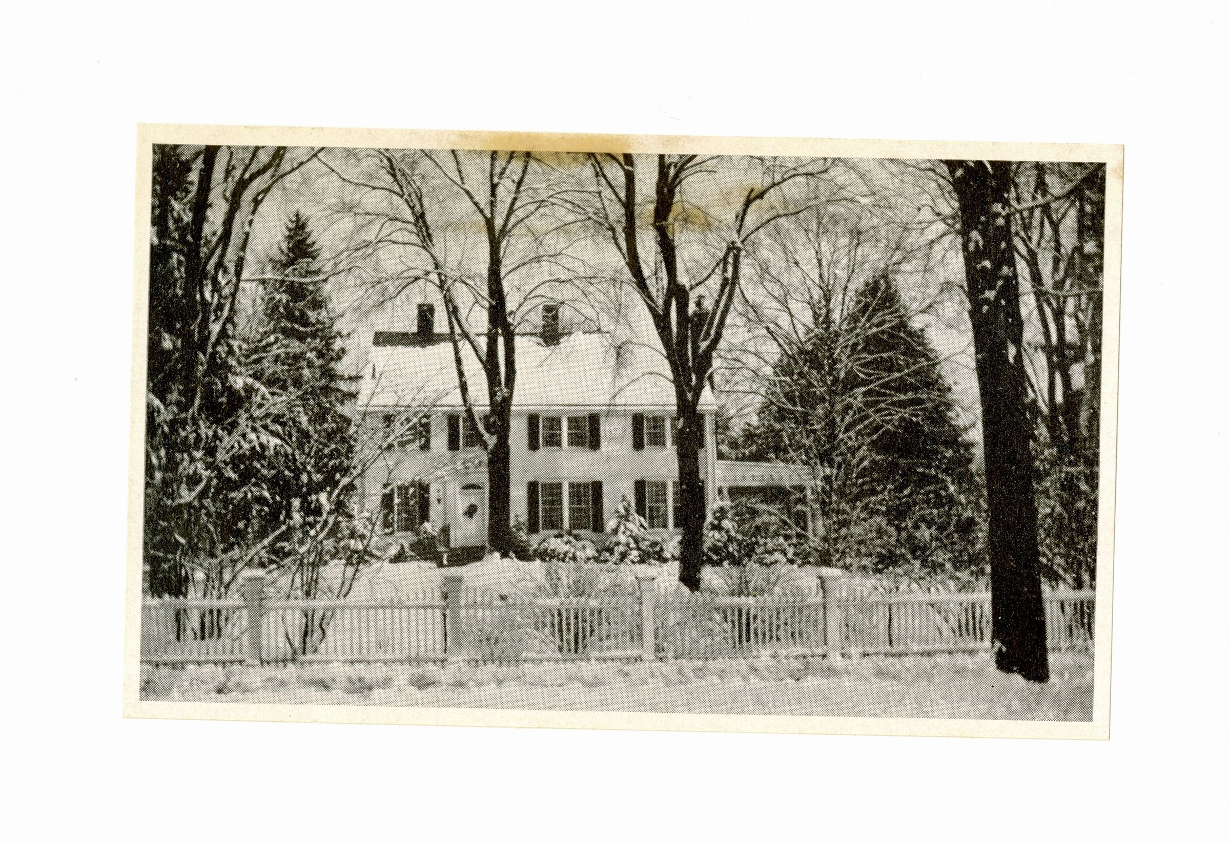 A three story house in the snow with tree-filled surrounding.