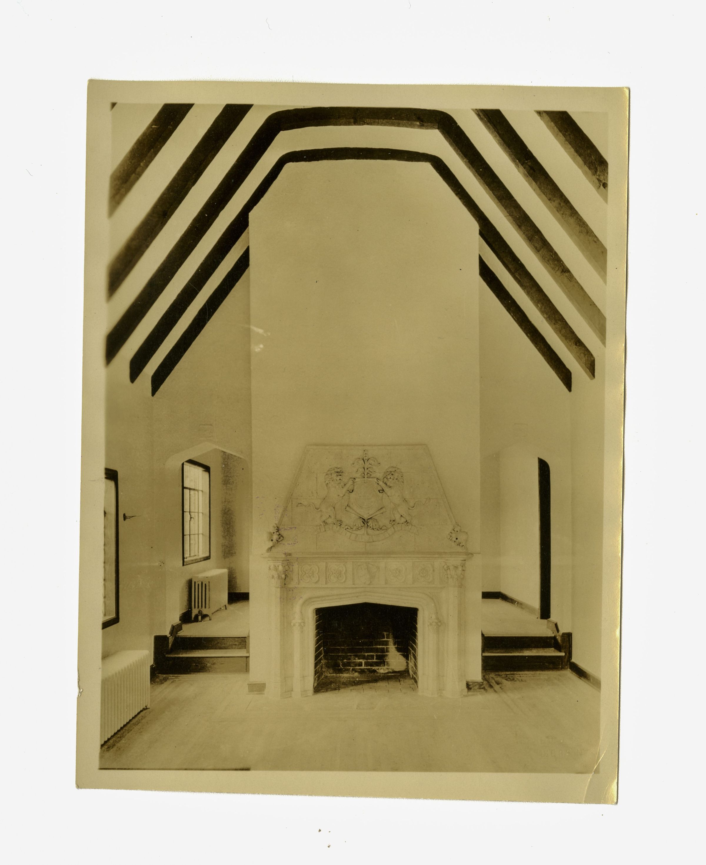 A room with a steeply vaulted ceiling and a fireplace with an elaborate stone mantelpiece.Collection