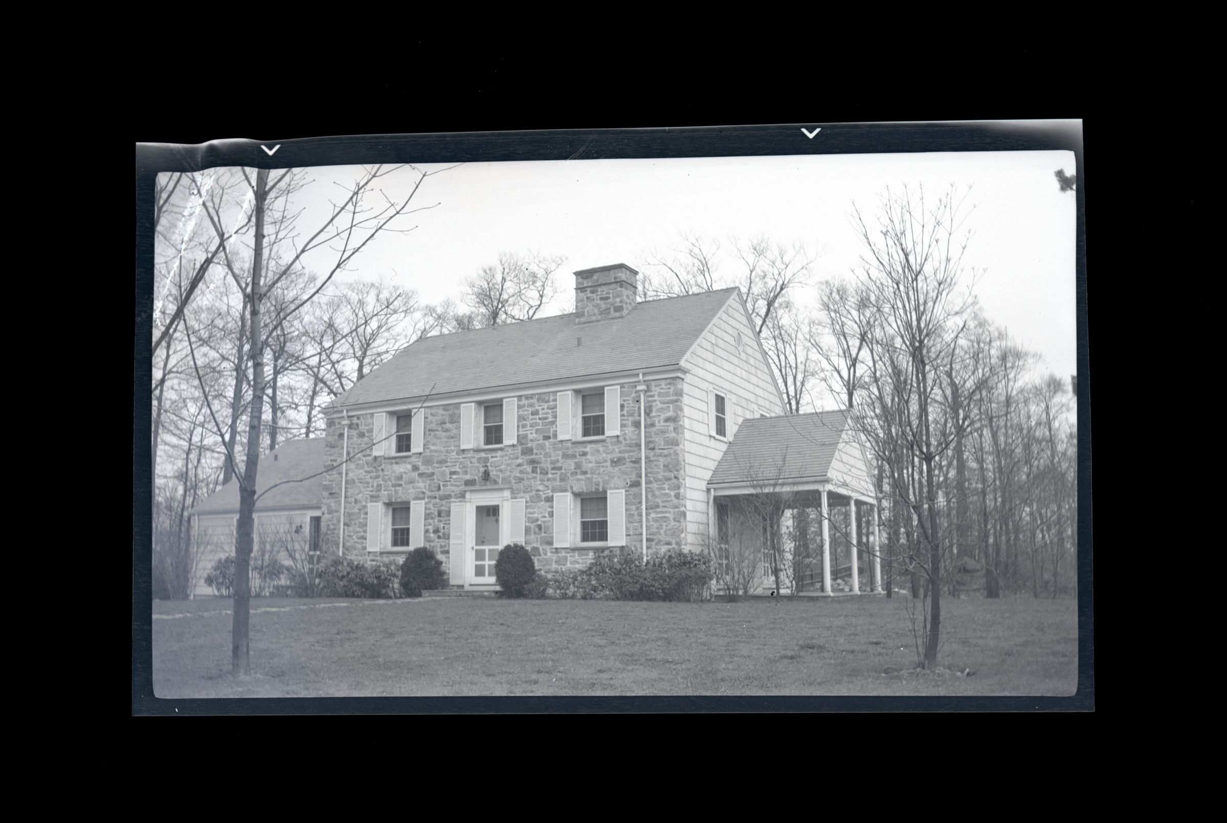 A three story house with a stone walled front wall and a shingle wall on the side.
