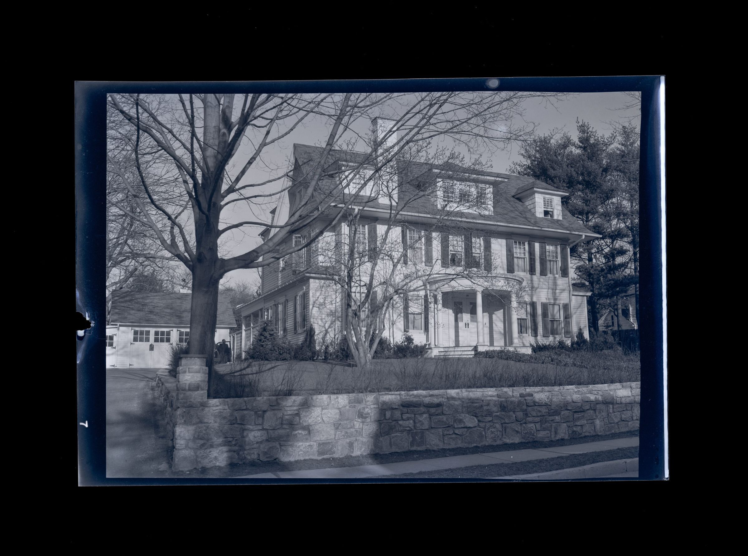 A three story house with dormers and a circular portico over the front door and a garage visible in the background.Collection