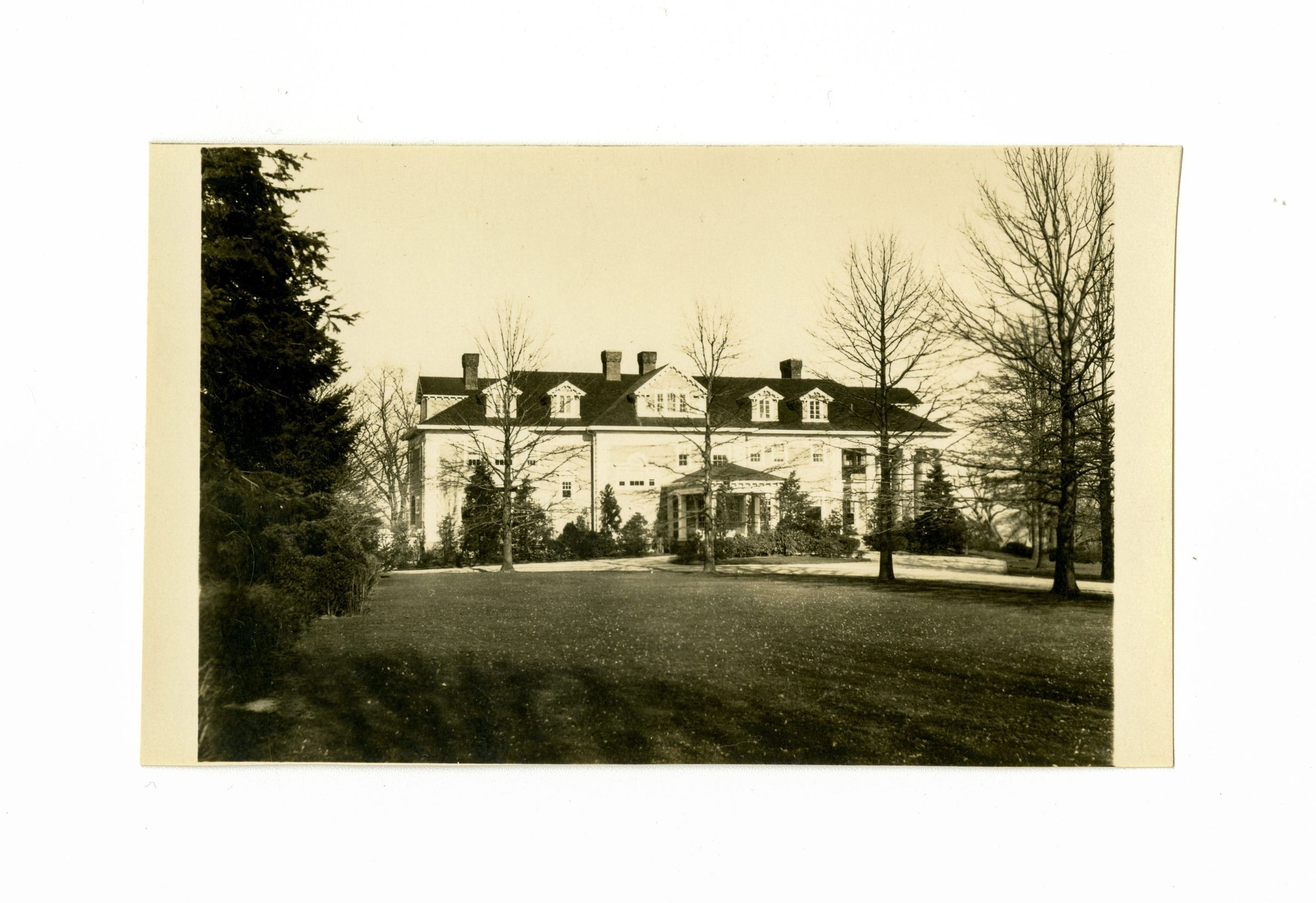 Front view of the mansion with garden in the foreground. The house has a distinctive two story side porch with Ionic columns surrounding a one story side wing; an extended portico over the driveway; and numerous dormers in the roof.Collection