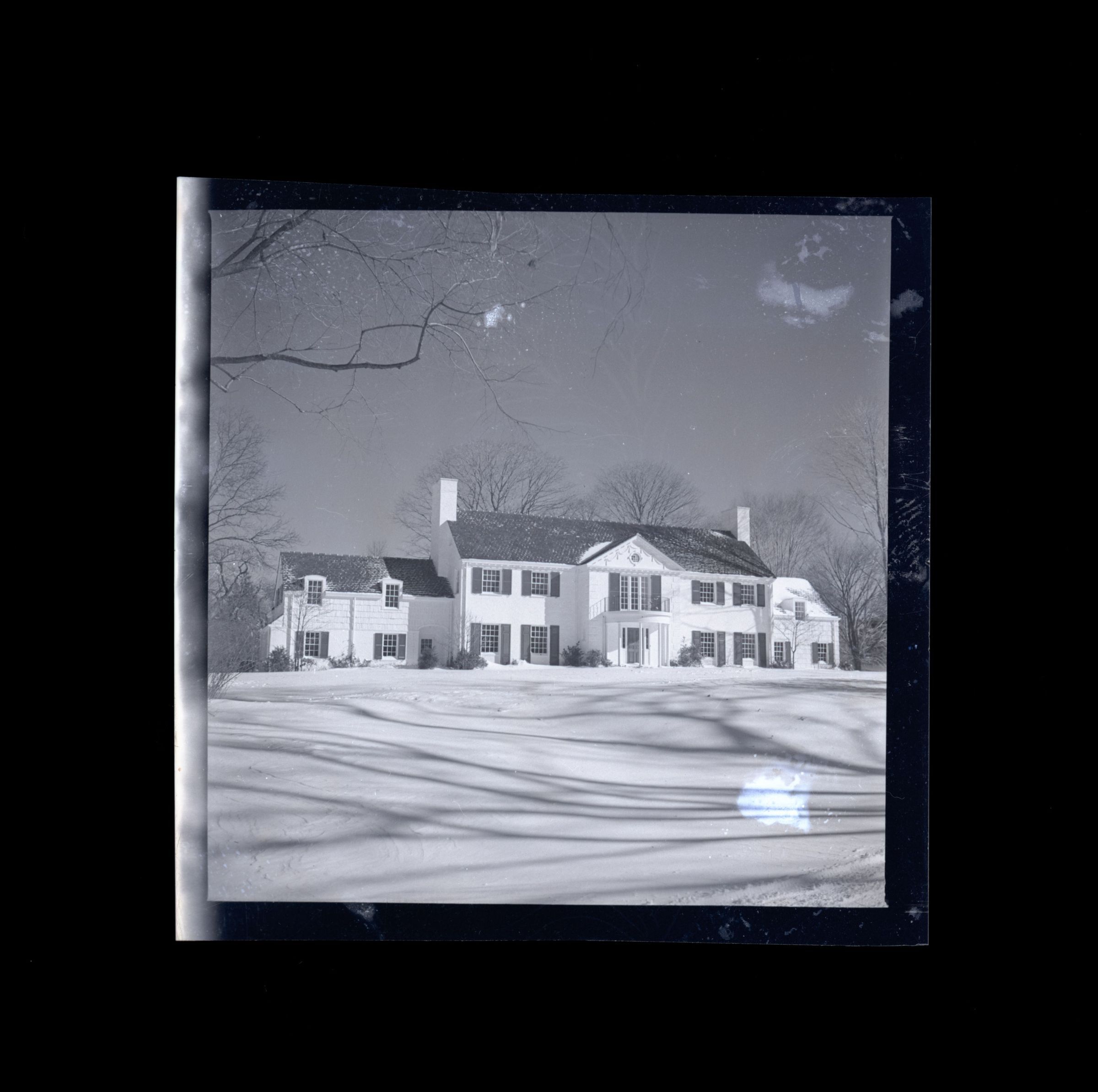 A three story house with a portico viewed from its snow covered lawn.Collection