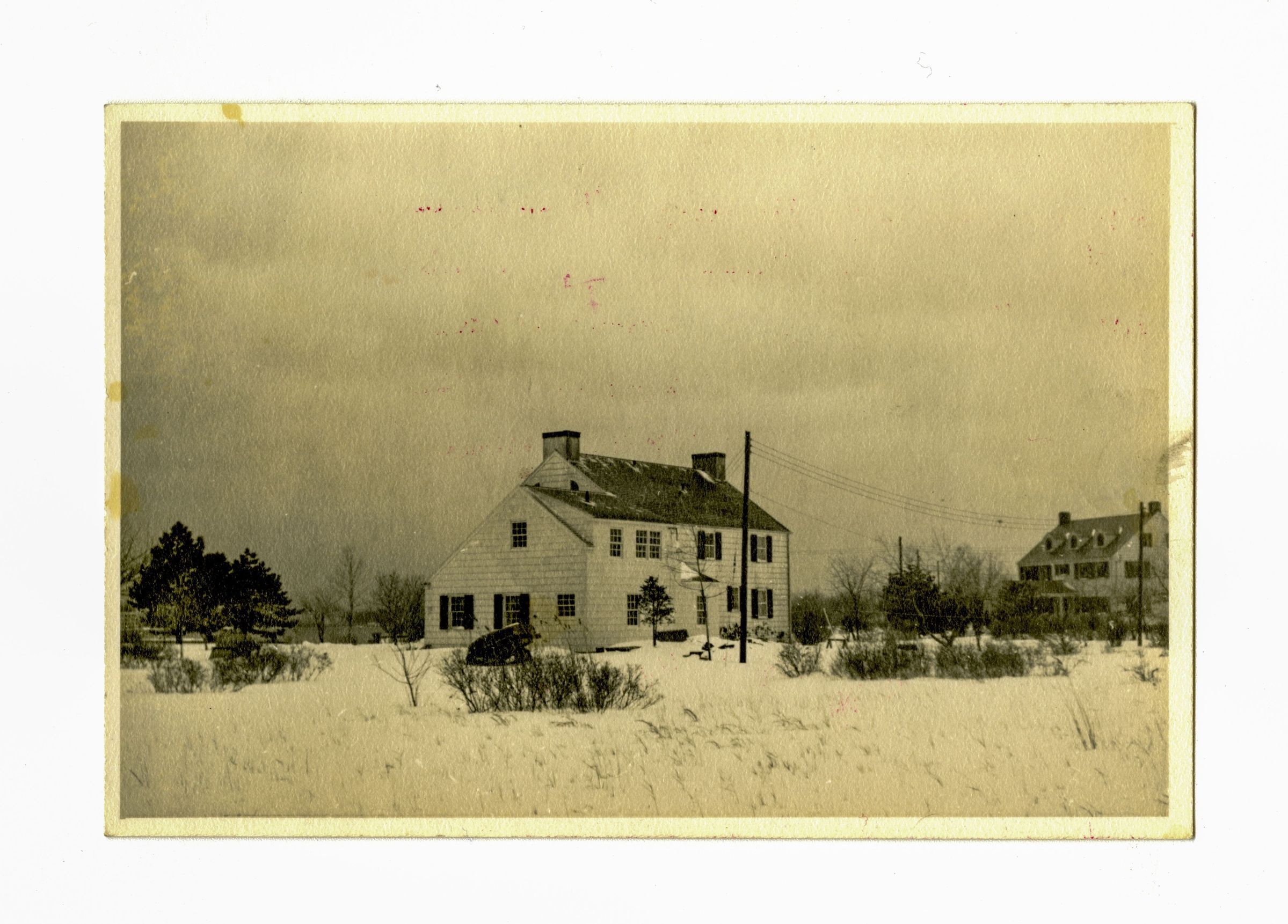 A three story saltbox-style house in the snow.