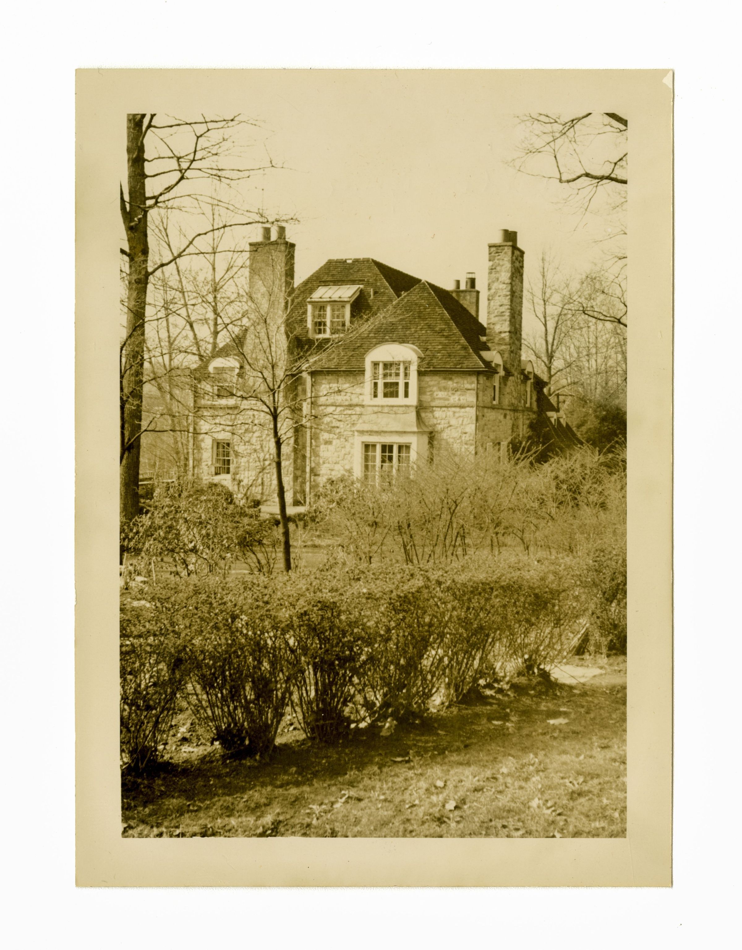 The side of a three story stone house viewed from its gardens.