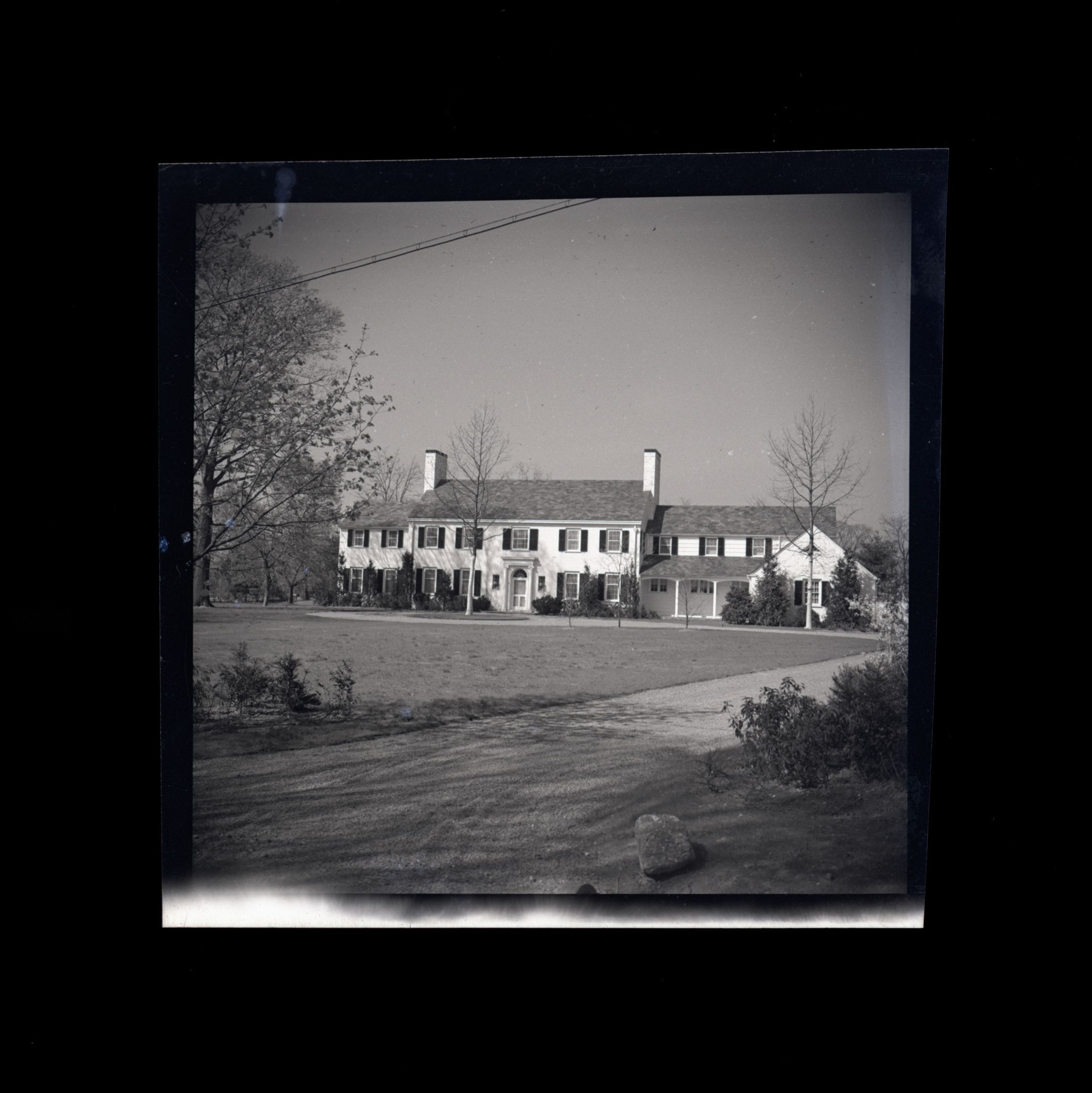A two story house and its lawn viewed from the entrance to its driveway.Collection
