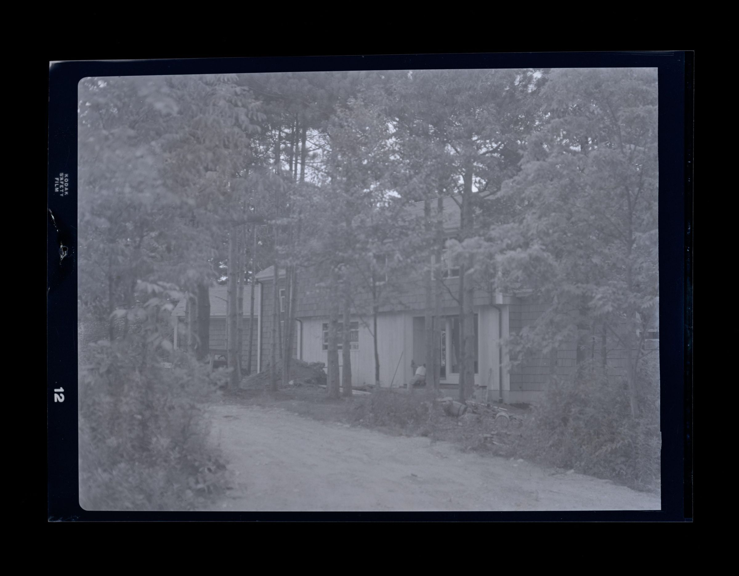 A two story shingle house in a wooded area viewed from an unpaved road.