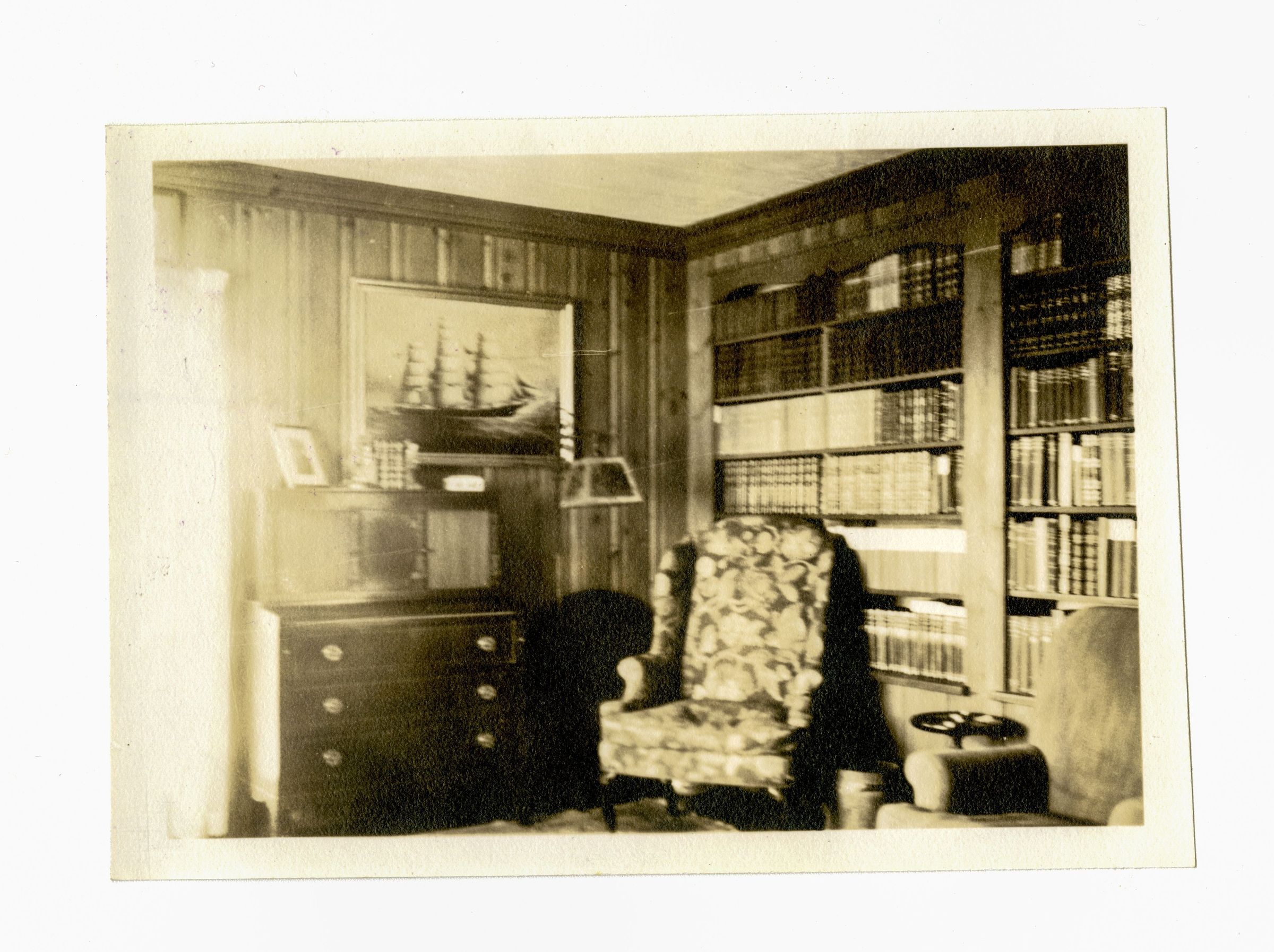 A view of a library or study with bookshelves, chairs, and a painting of a ship visible.Collection