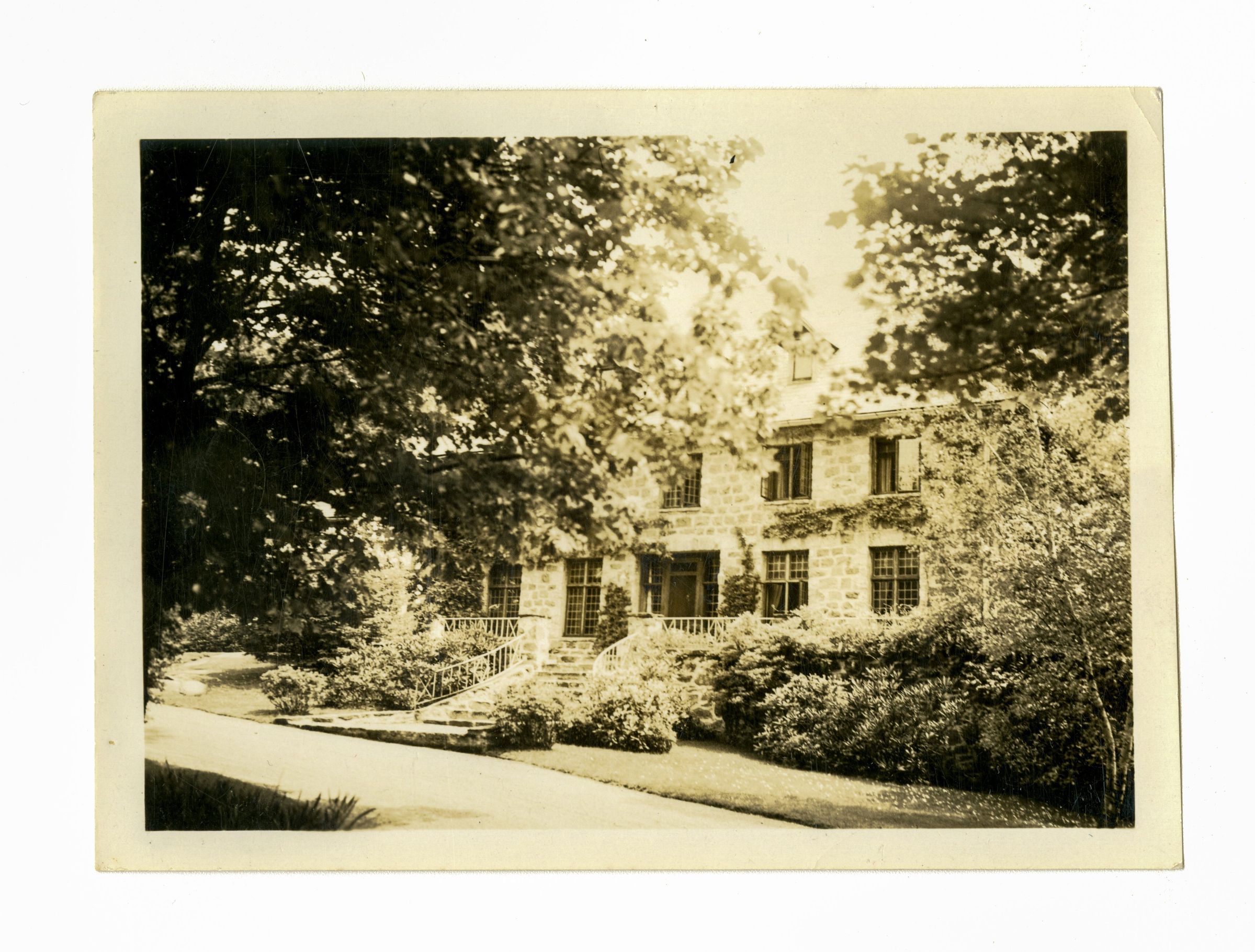 A three story stone house viewed from its driveway.