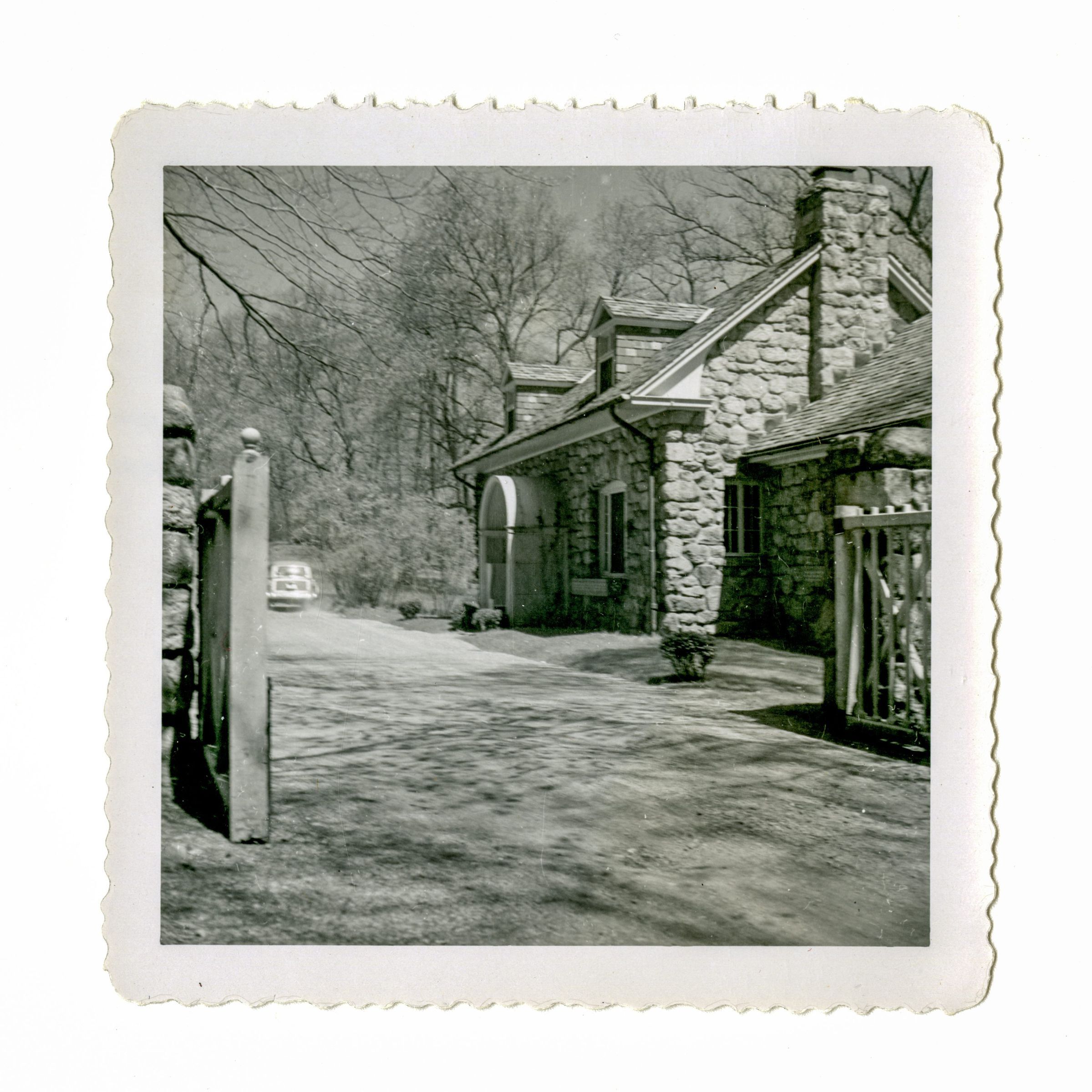 A view of the stone guesthouse (former gatehouse) from the drive; a car is driving away from the guesthouse in the background.Collection