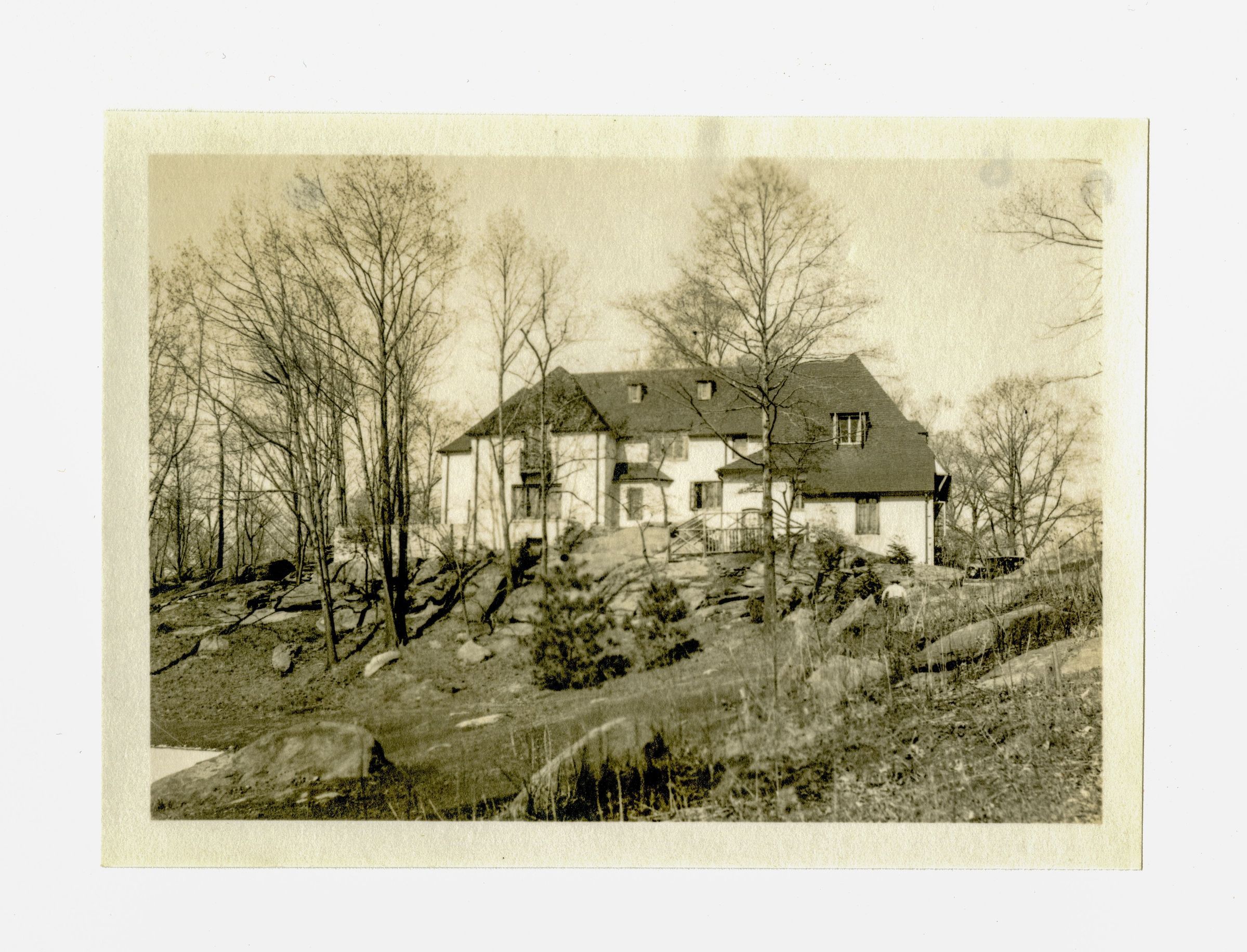 The back of a French-style brick house and part of its grounds.