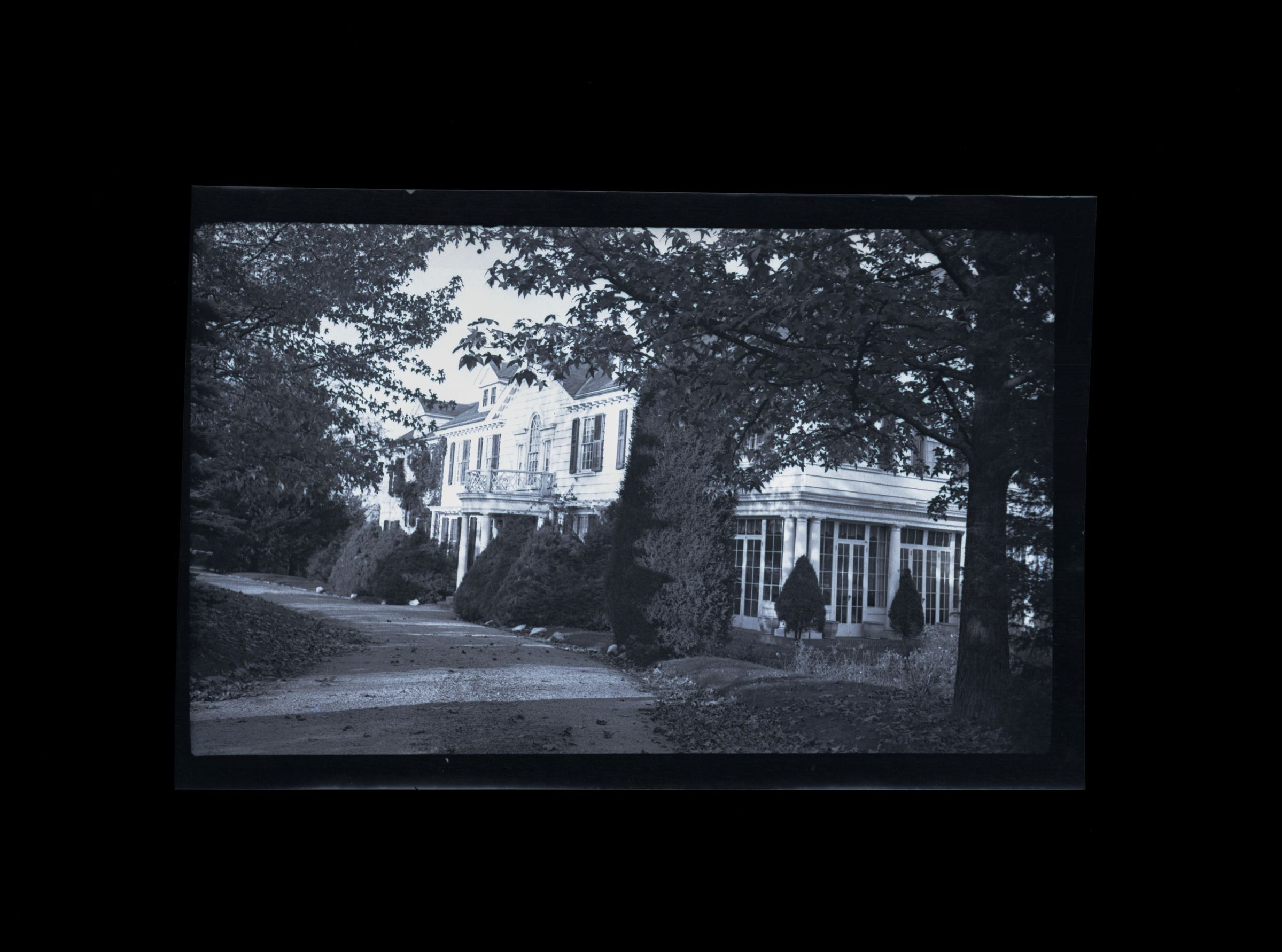 A view from the driveway of a three story home, looking down the driveway across the face of the building.Collection