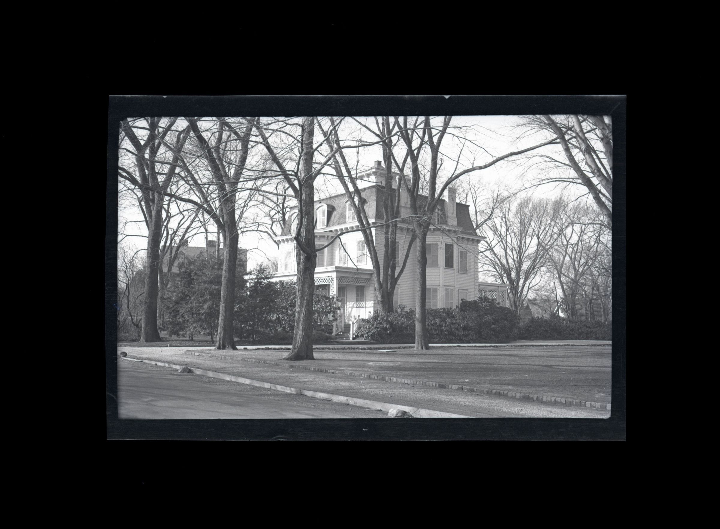 A three story French-style house and the lawn of the neighboring house.