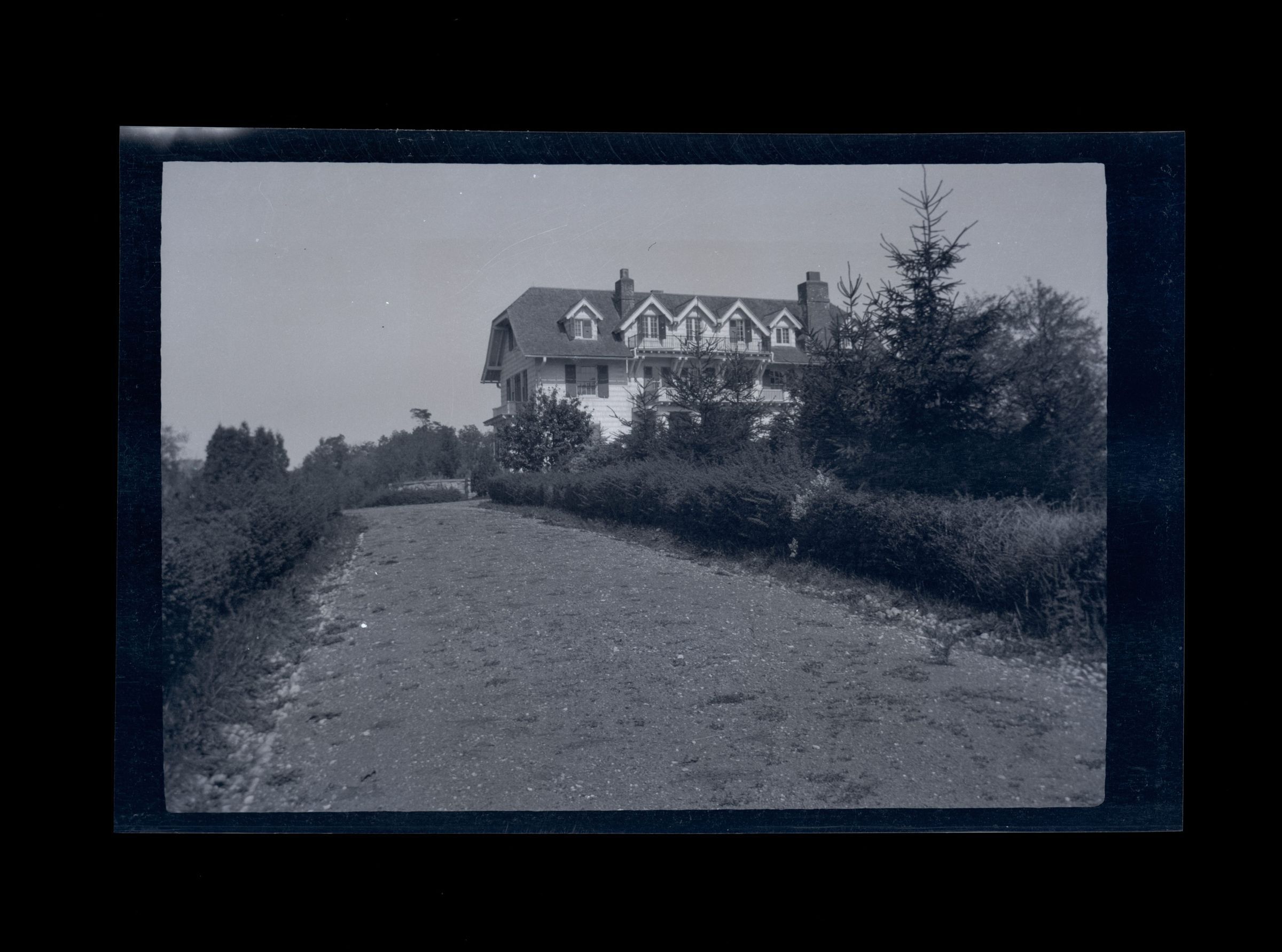 A three story house with a jerkinhead-roof viewed from an unpaved road.