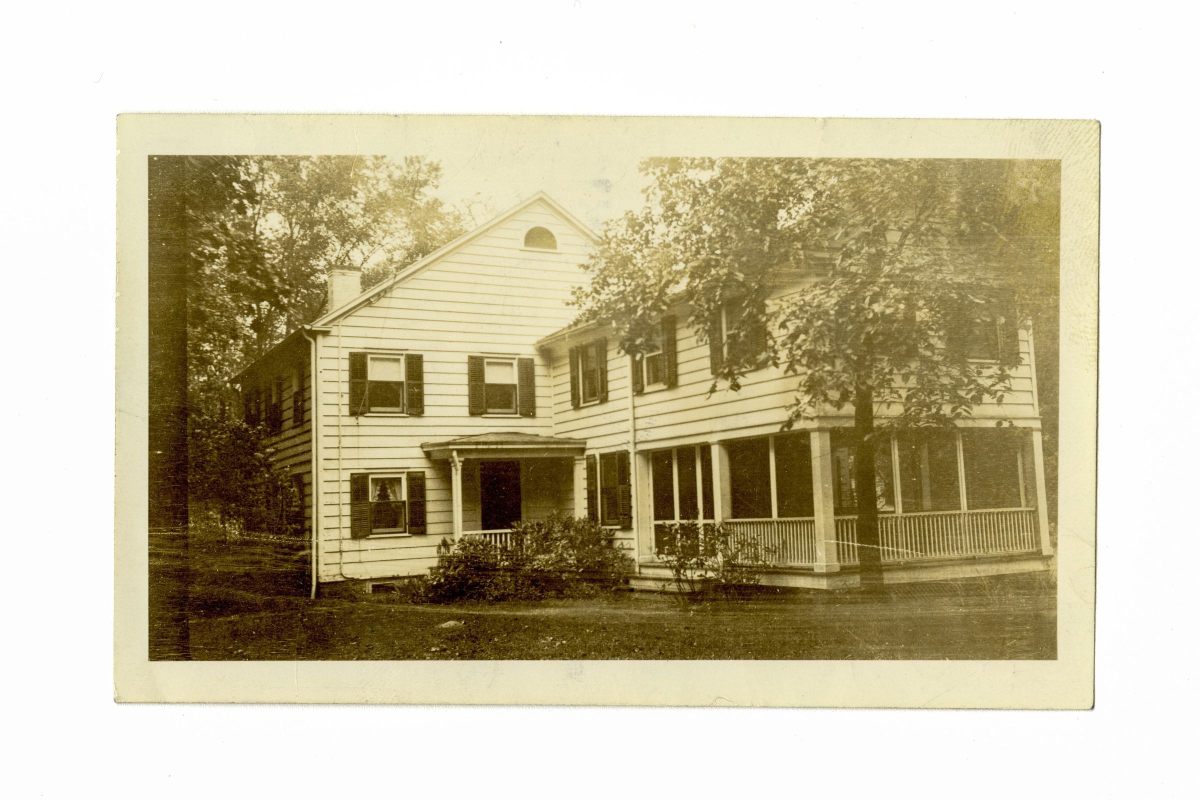A three story clapboard house and its porch that sits under a wing of the house.Collection