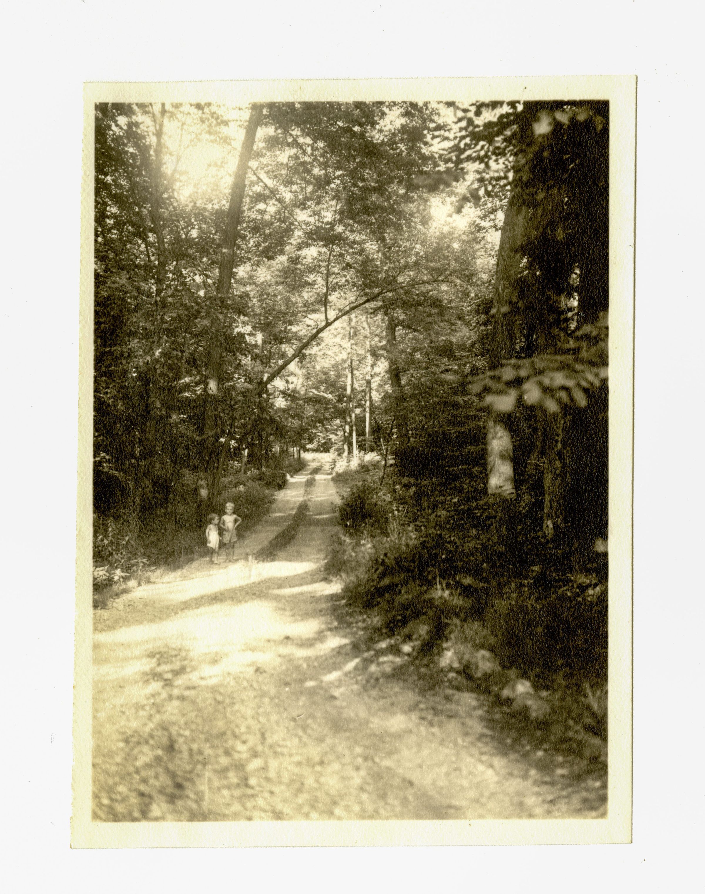 A tree-lined dirt road on the estate with two children standing on the side of the road.Collection