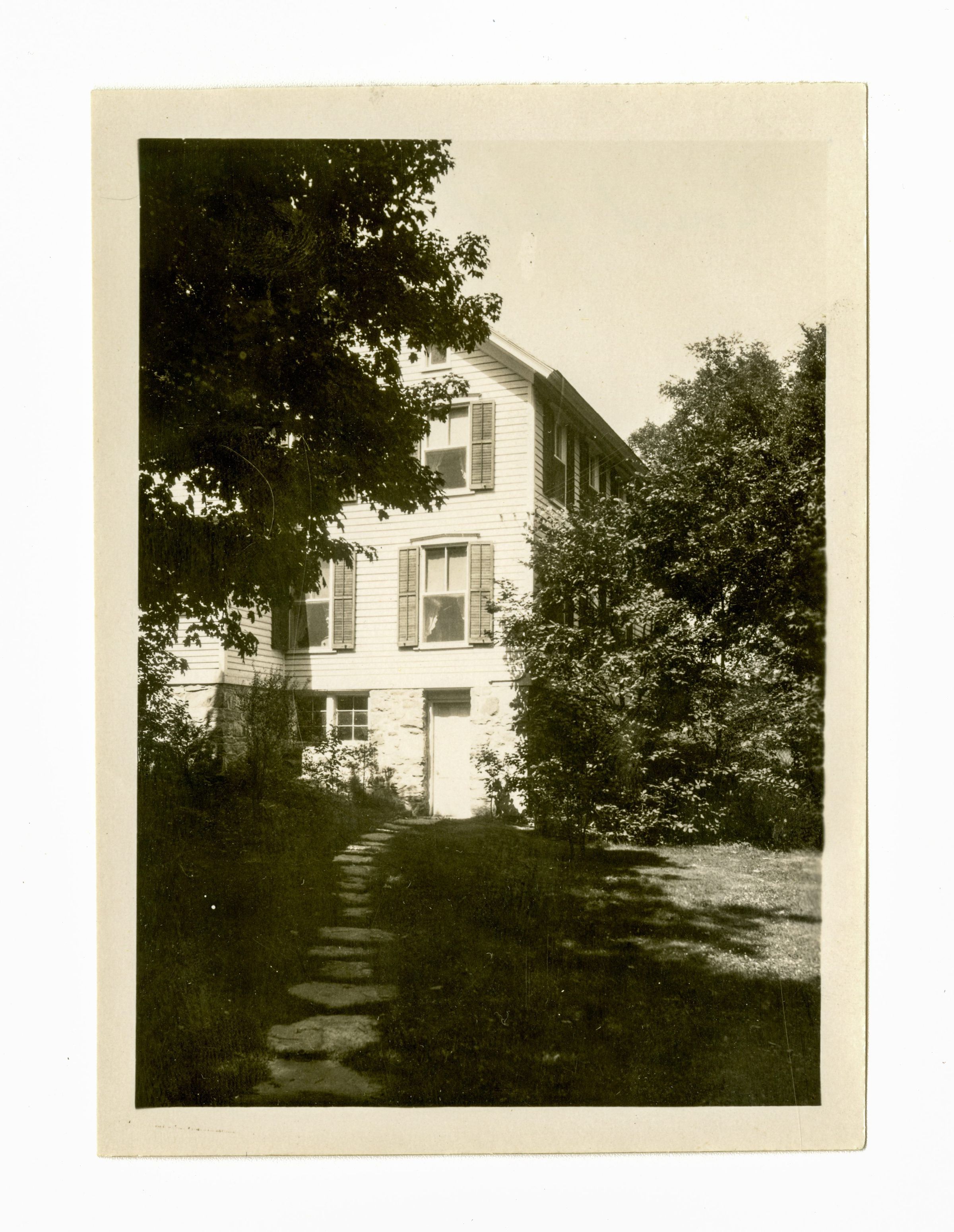 A view of a three story house from a stone path in its lawn.