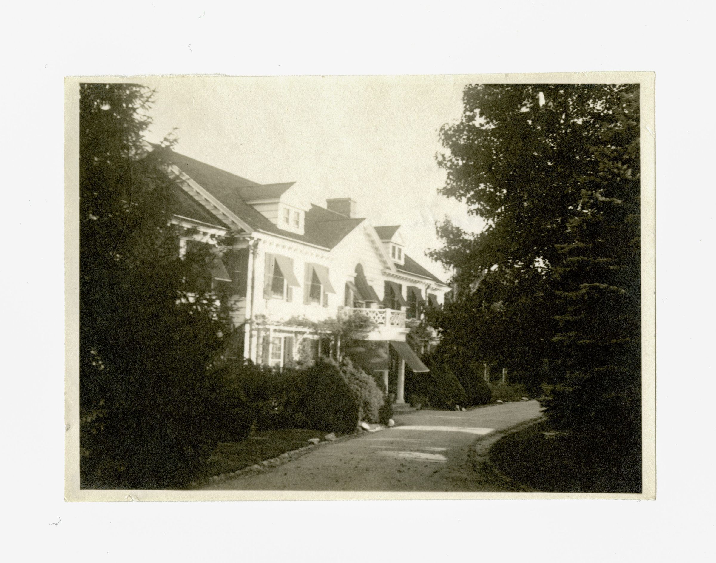 A three story house with awning covered windows and entranceway viewed from its driveway.Collection