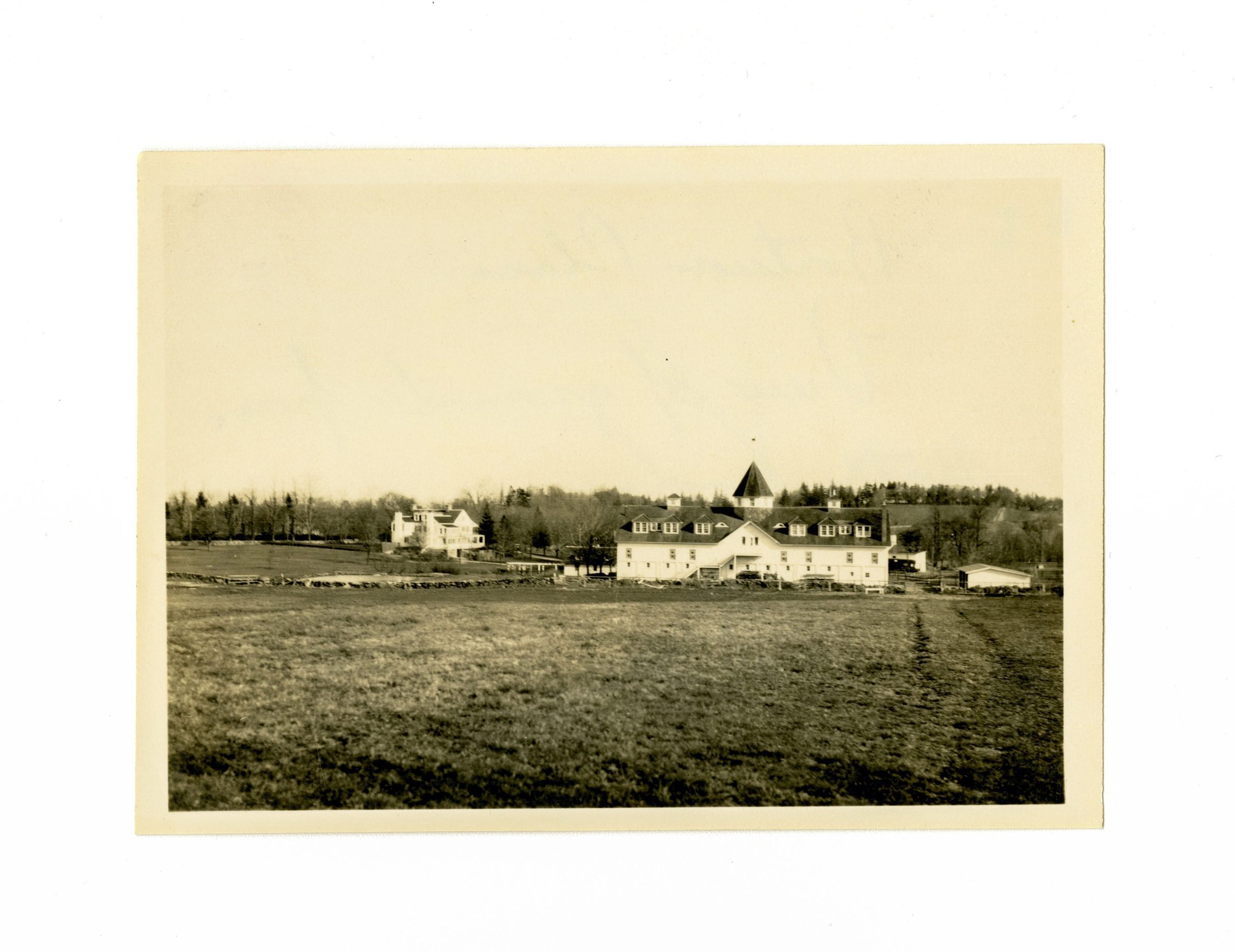 A three story building with a tower on the middle of the structure viewed from a field.Collection