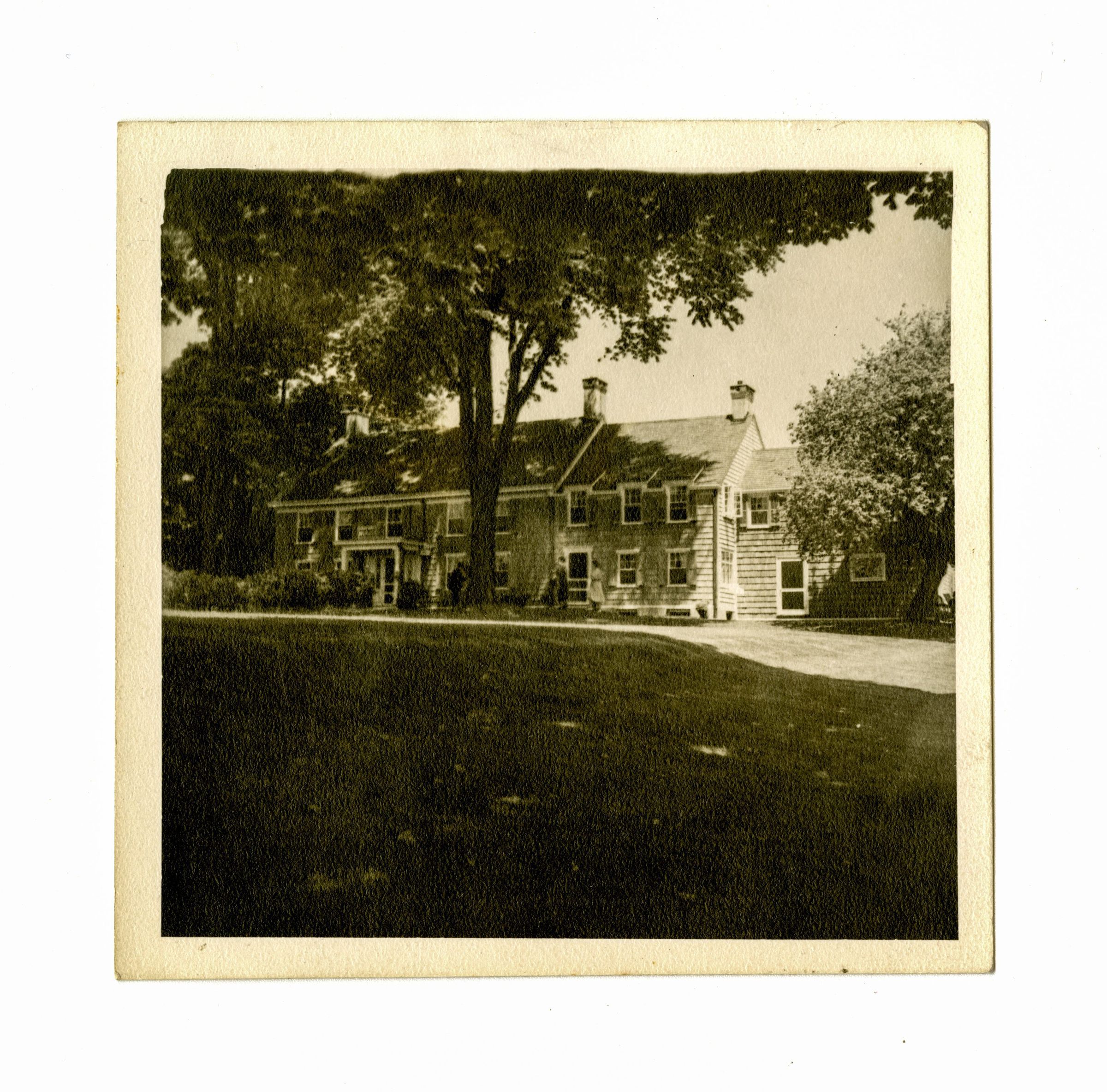 A view from the front lawn of a three story shingle house and its front lawn. Two women are standing in front of the house.Collection