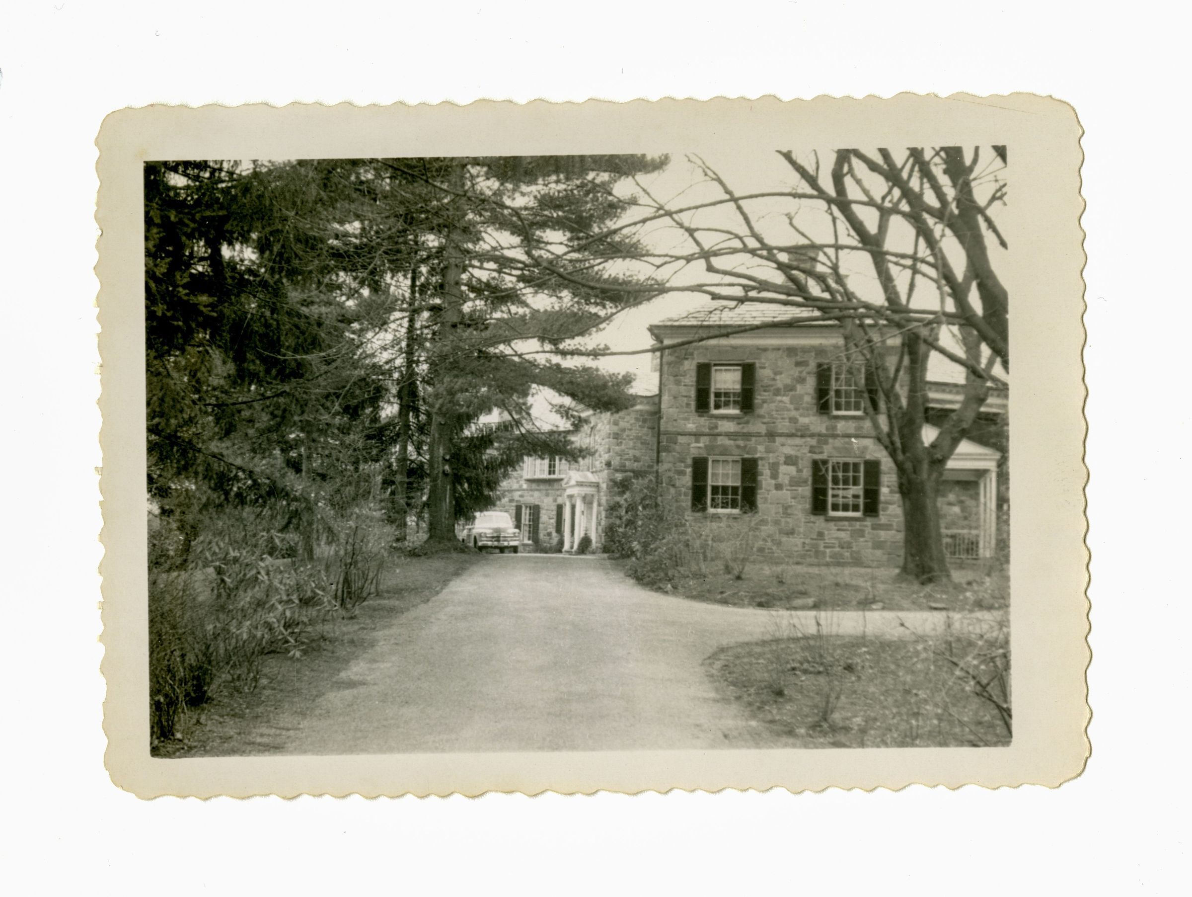 A view of the side and driveway of a two story stone building. A car is parked in the driveway.Collection