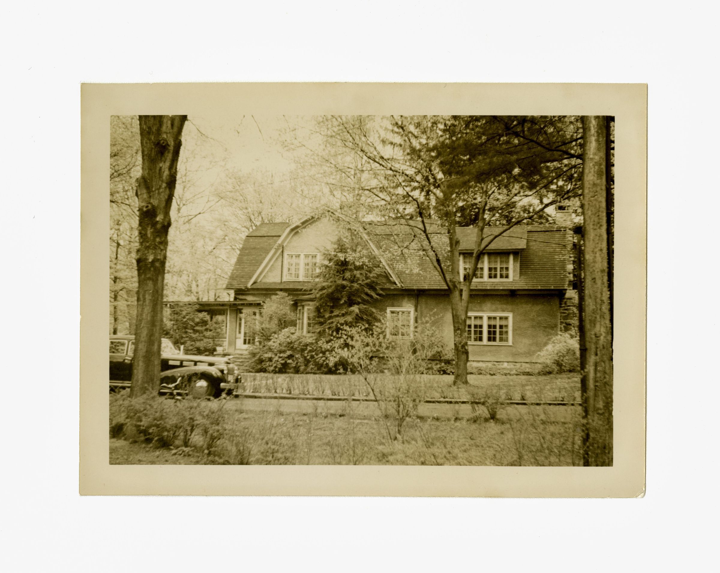 The front of a two story house viewed from across the street with a car parked on the street on the left of the image.Collection