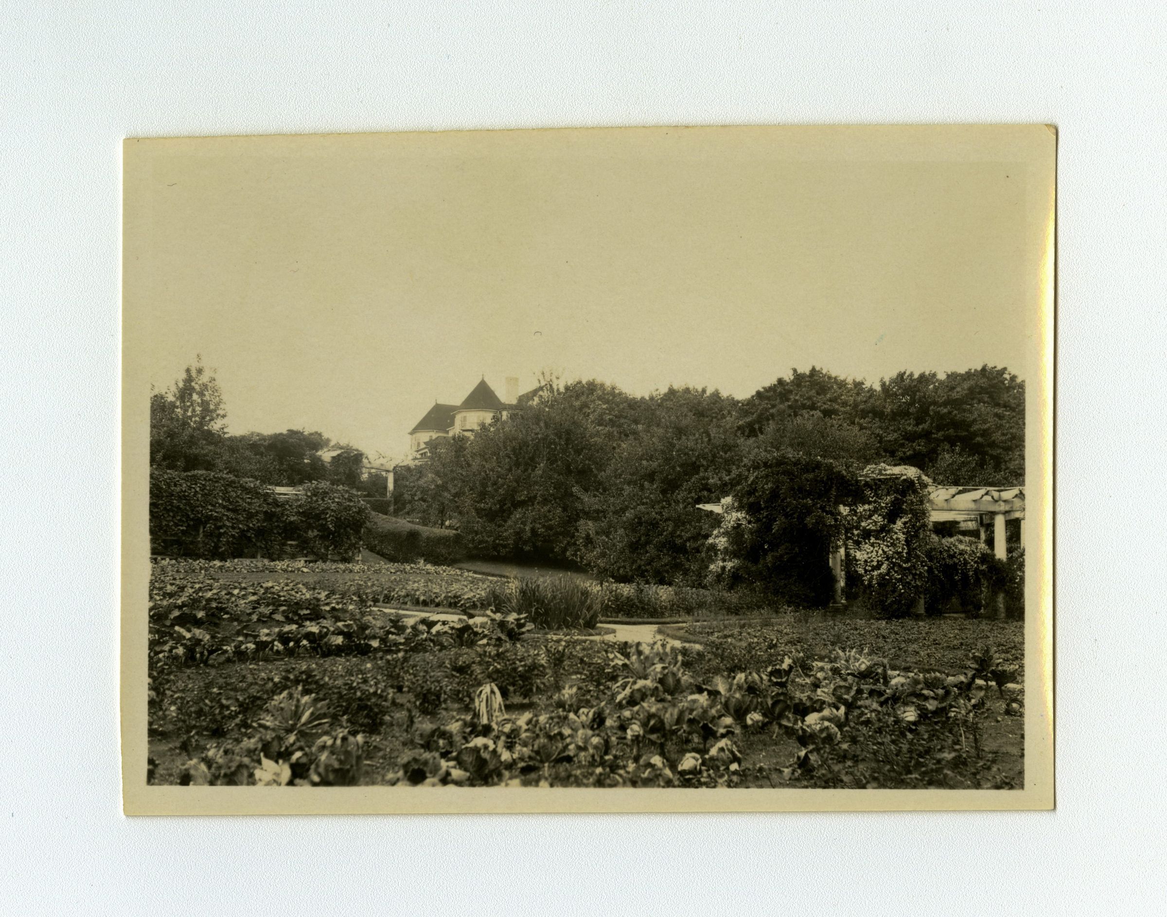 The gardens of the estate with a trellis covered walkway on the right of the image.