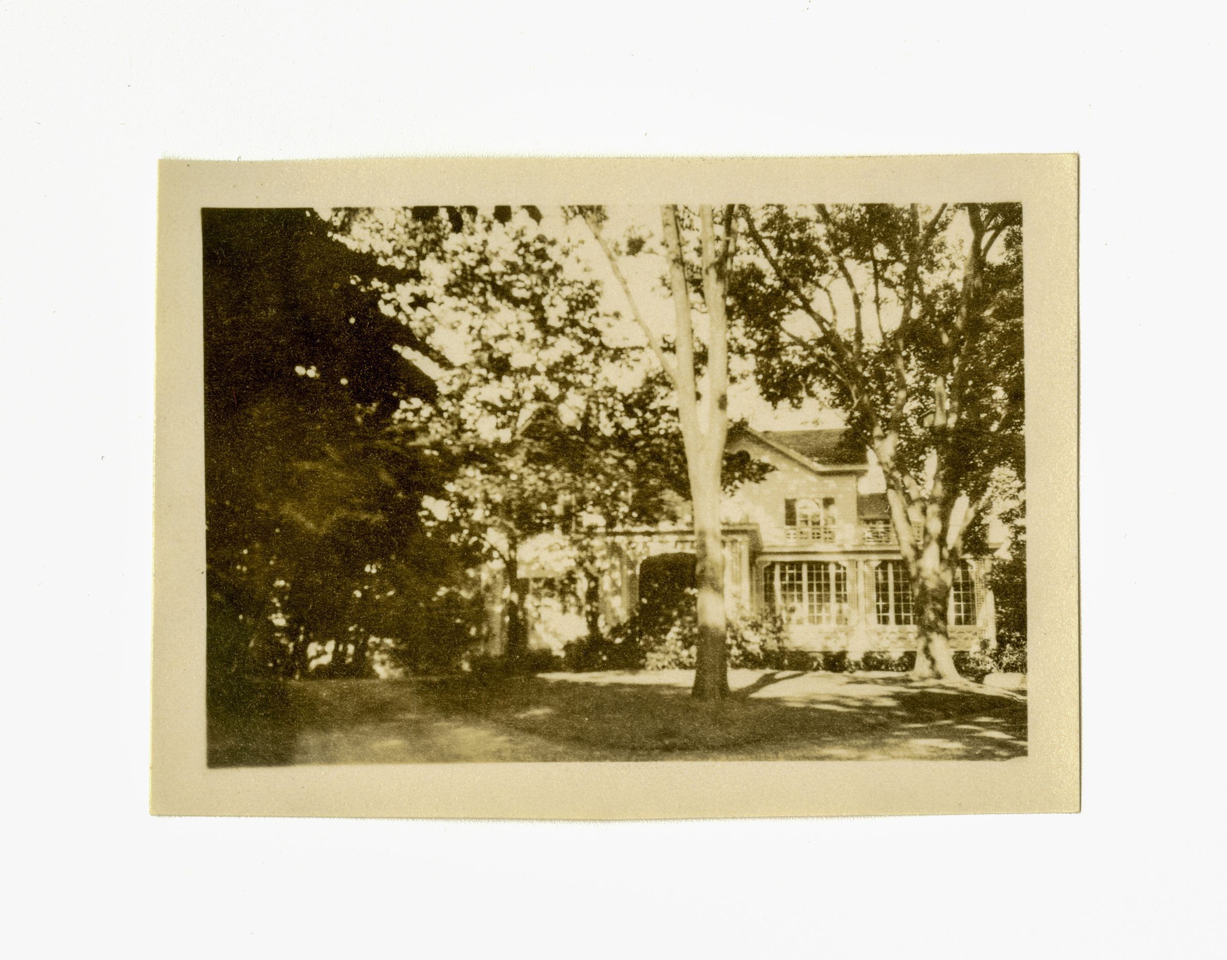 A view of a house from its driveway. There are a number trees planted around the driveway and the front of the house.Collection