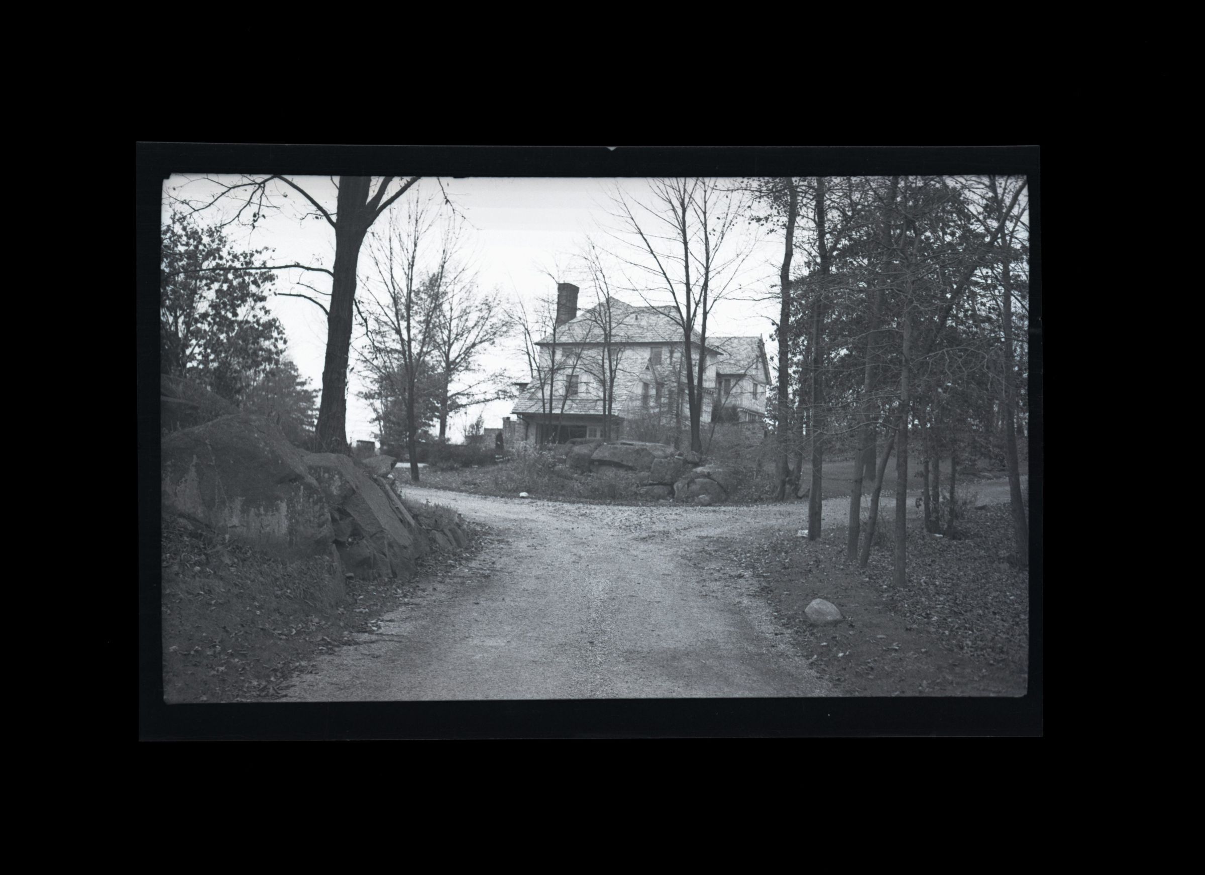 A view looking at a fork in the driveway of the three story house visible in the background.Collection