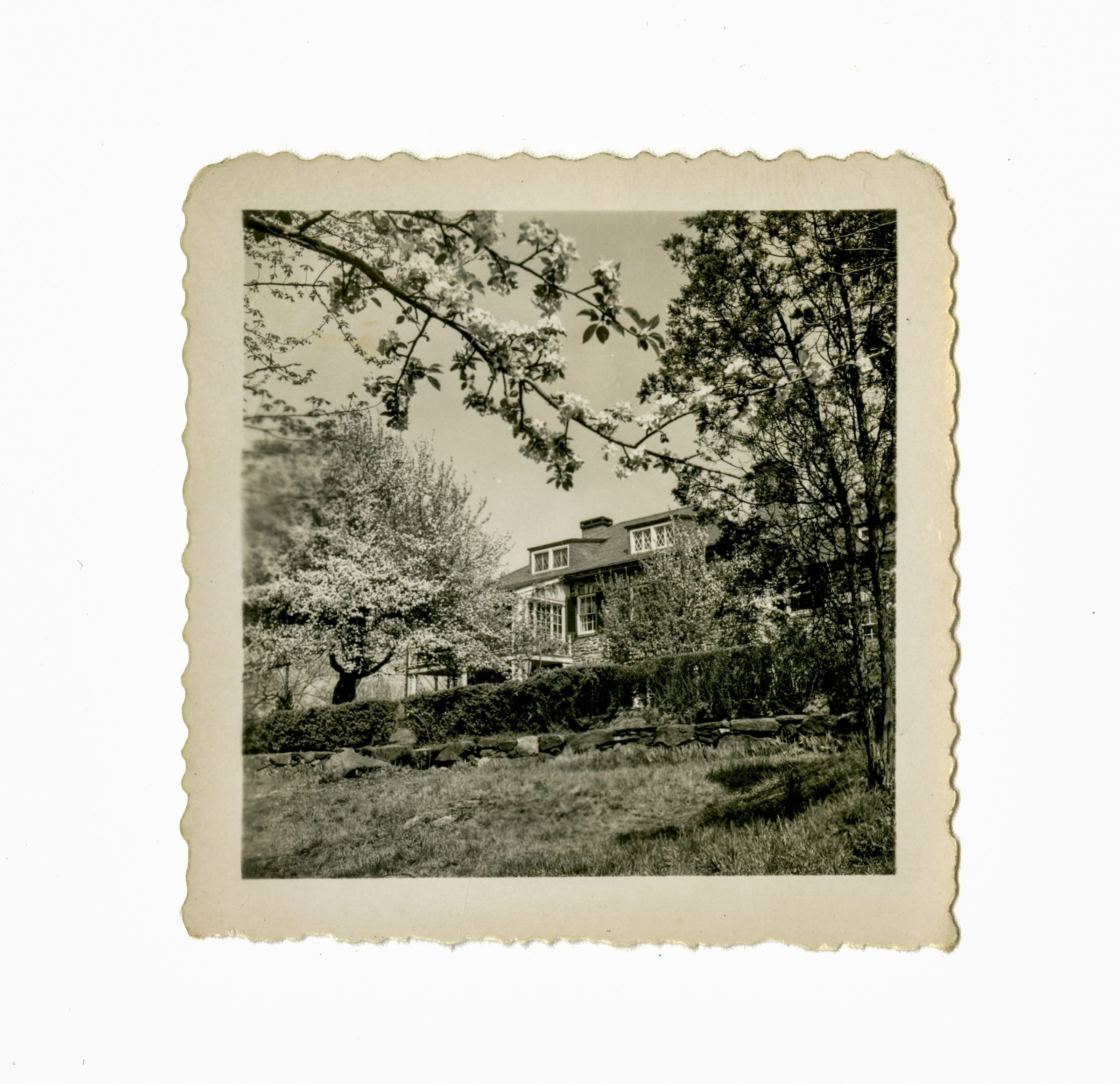 A view from the lawn looking towards a three story house with several flowering trees in the image.Collection