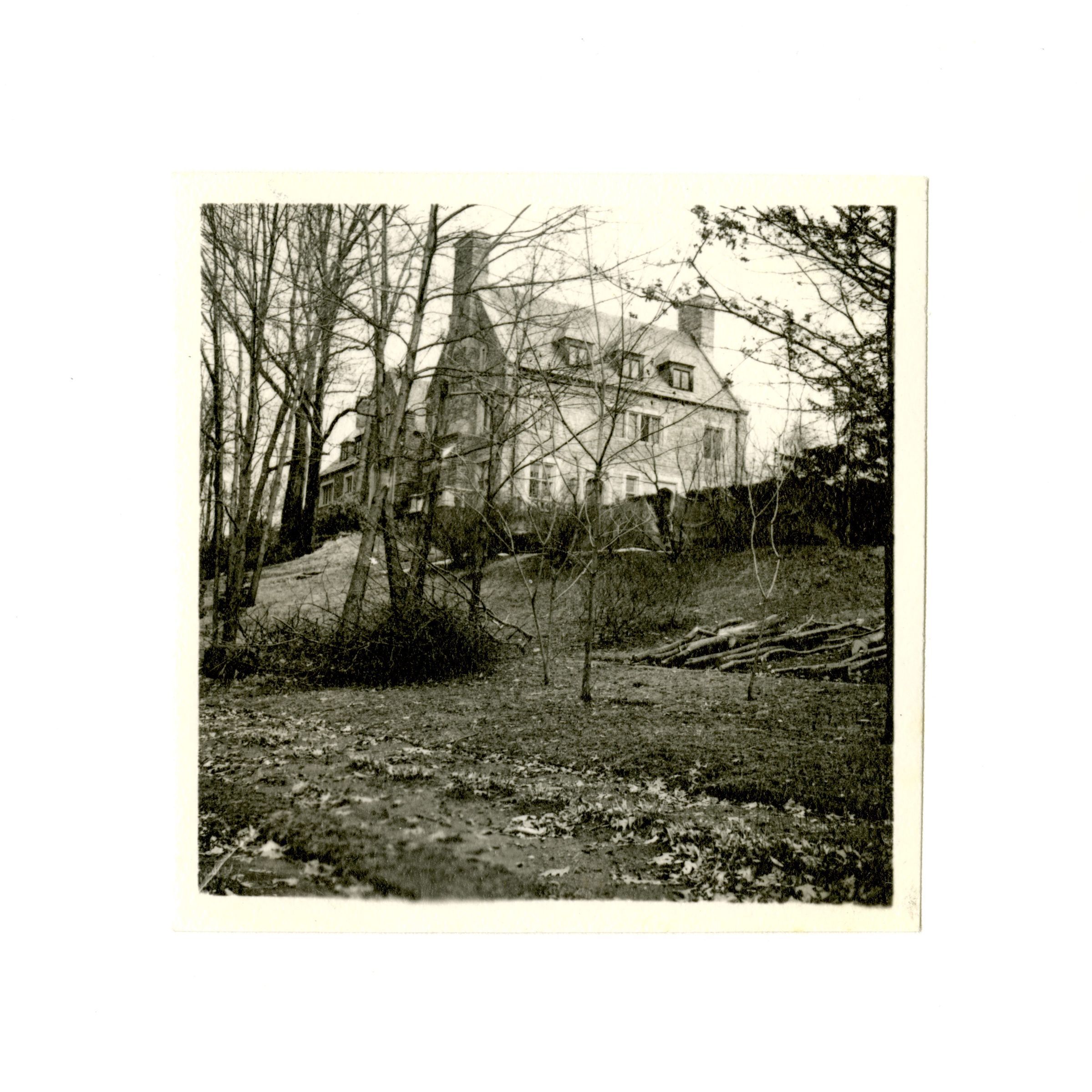 A view looking up a small hill towards a stone house with small dormers.Collection