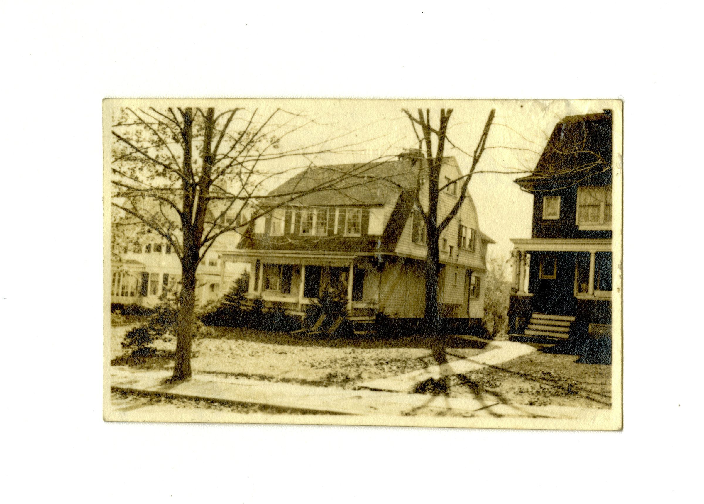 A three story shingle house with a gambrel-style roof and its front lawn viewed from the street.Collection